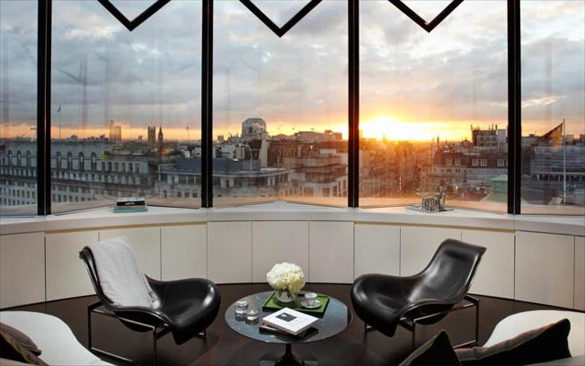 www.melia.comΣτο σαλόνι της σουίτας Me στο ξενοδοχείο ME του Λονδίνου, αισθάνεσαι λες και βρίσκεσαι σε φάρο, καθώς το δωμάτιο είναι κυκλικό με τζαμαρία και η θέα που απλώνεται μπροστά και γύρω-γύρω είναι όλο το κεντρικό Λονδίνο. Το βλέμμα των περισσοτέρων τραβά το παλάτι του Μπάκιγχαμ, το μνημείο του Νέλσον και η περιοχή Canary Wharf. www.melia.com