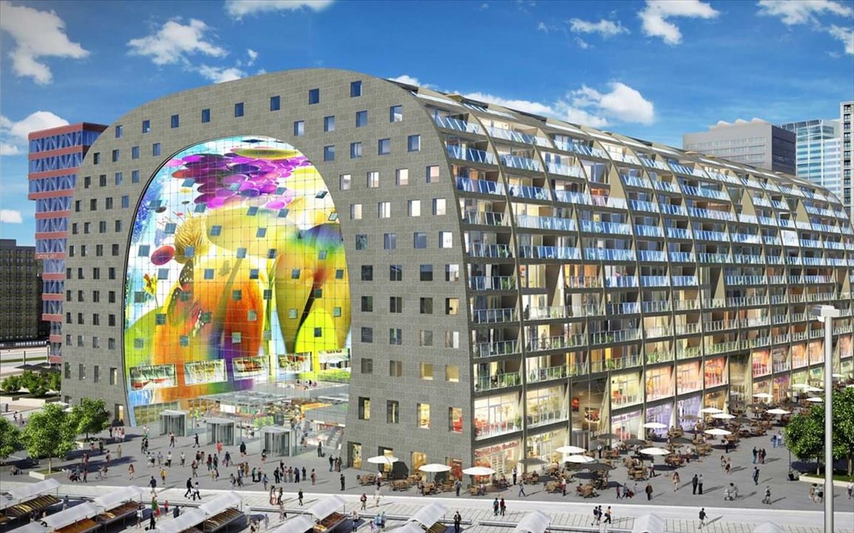 Το νέο εμπορικό κέντρο Markthal των 175 εκατομμυρίων ευρώ στο Ρότερνταμ είναι πλέον γεγονός: έχει pop ύφος, είναι τετραώροφο και έχει τοξοειδή οροφή 40 μέτρων, το εσωτερικό της οποία αναπαριστά μια ψηφιακή τοιχογραφία των καλλιτεχνών Arno Coenen και Iris Roskam, που έχει και… ήχο. Σε αυτήν απεικονίζονται προϊόντα μαναβικής που μπορεί να αγοράσει κανείς μέσα στην αγορά, ενώ τα λουλούδια και τα έντομα αναφέρονται στα έργα νεκρής φύσης Ολλανδών καλλιτεχνών από τον 17ο αιώνα.