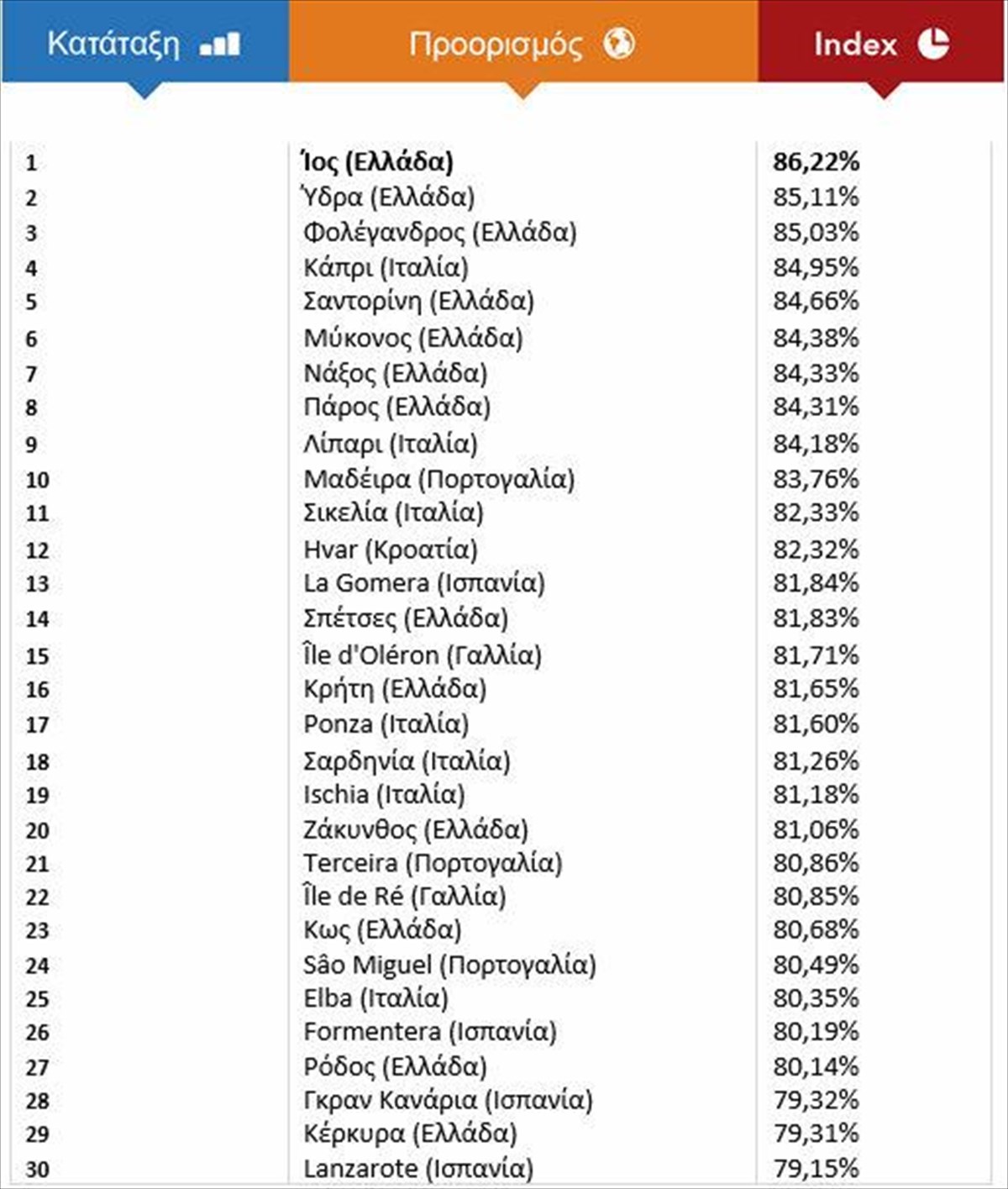 Την πρώτη θέση καταλαμβάνει η μαγευτική Ίος με ποσοστό δημοτικότητας 86,22 τοις εκατό, ακολουθούμενη από ένα από τα πιο όμορφα νησιά του Αργοσαρωνικού, την Ύδρα.
