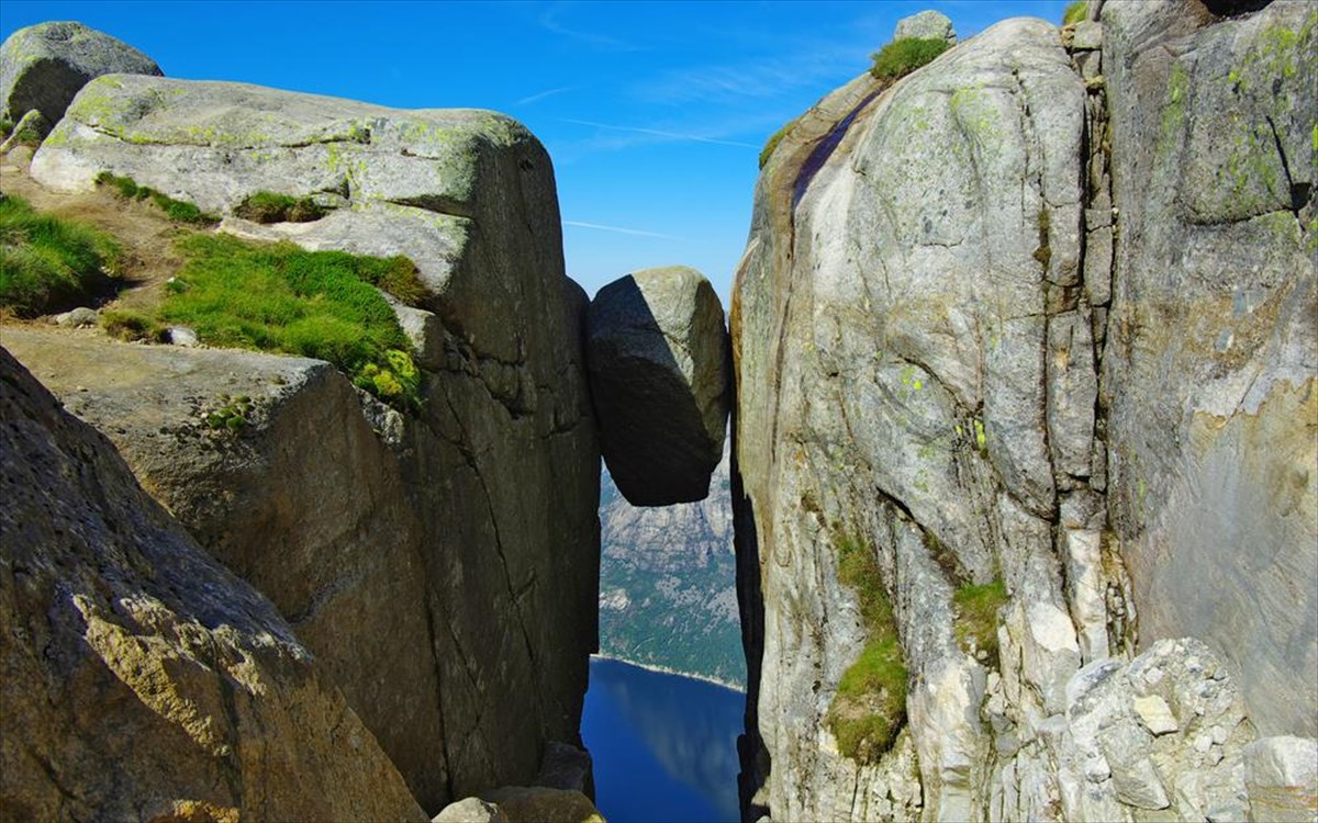 Kjeragbolten, Νορβηγία. Ο 5 κυβικών μέτρων ογκόλιθος στο βουνό Kjerag στην επαρχία Rogaland, προσβάσιμος χωρίς εξοπλισμός αναρρίχησης.
