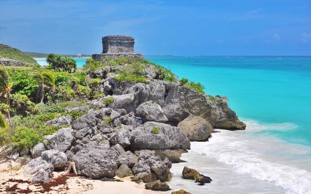 Tulum, Μεξικό και ερείπια των Μάγια πάνω από τη θάλασσα, σε μια πρώην πόλη με τείχη, μια από τις τελευταίες που έχτισε ο λαός αυτός των Ινδιάνων της Κεντρικής Αμερικής.