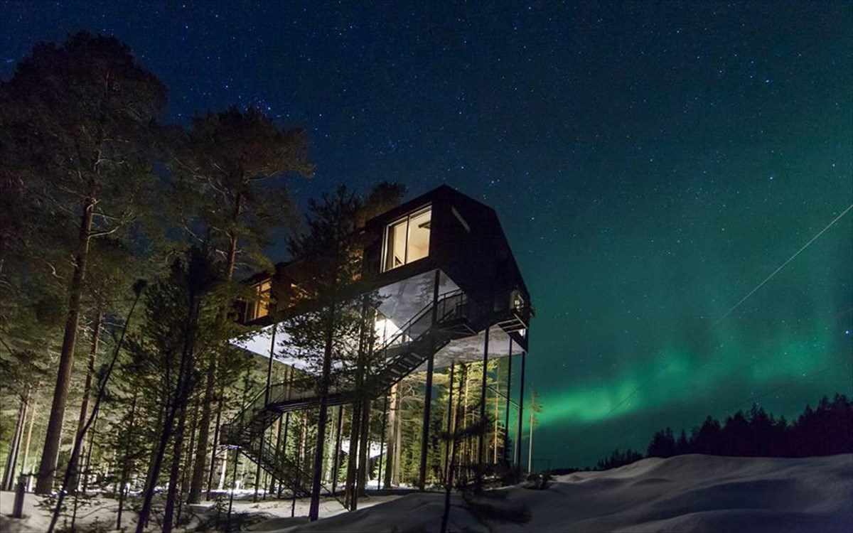 «Κρυμμένο» στα ήσυχα δάση και τις χιονισμένες όχθες της βόρειας Σουηδίας, περίπου 1 ώρα πτήση βόρειας της Στοκχόλμης, το Treehotel δεν θα μπορούσε να είναι πιο απομονωμένο. Στους επισκέπτες του δάσους, τα δωμάτια μπορεί να τους θυμίσουν UFO από απόσταση, αφού βρίσκονται σκαρφαλωμένα πάνω στα δέντρα, δημιουργώντας μια απόκοσμη αίσθηση. Tο μεγαλύτερο δωμάτιό του, μάλιστα, είναι ένα δωμάτιο που θυμίζει διαμέρισμα και είναι χτισμένο 10 μέτρα πάνω από το έδαφος. Με τα πανοραμικά παράθυρά του μπορεί κάποιος να αισθανθεί ότι κοιμάται κάτω από τα αστέρια και φυσικά να απολαύσει το Βόρειο Σέλας με τον καλύτερο τρόπο.