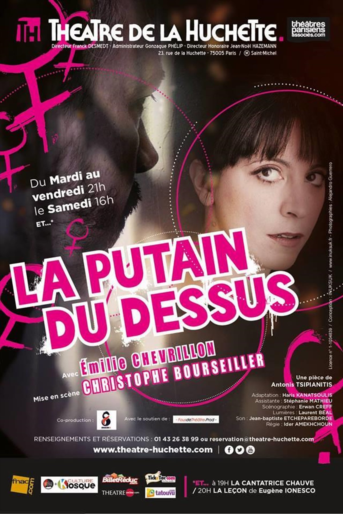 Θα παρουσιαστεί στο Παρίσι, στο ιστορικό θέατρο La Huchette, που κατέχει το παγκόσμιο ρεκόρ παραστάσεων έργων του Ιονέσκο  παίζονται αδιάλειπτα από το 1957-, υπό τον τίτλο «La Putain du Dessus». Τη σκηνοθεσία του θα αναλάβει ο Christophe Bourseiller, ενώ την ερμηνεία του η ηθοποιός Emilie Chevrillon.