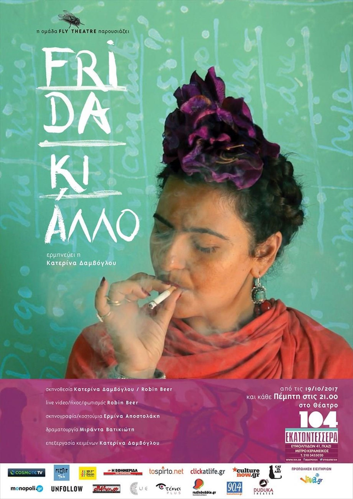 Θέατρο 104, Ευμολπιδών 41, Γκάζι-Μετρό Κεραμεικός. Από 19 Οκτωβρίου 2017. Κάθε Πέμπτη 21.15. Πληροφορίες: Τηλ.: 2103455020. Τιμές εισιτηρίων: 10 ευρώ, 5 ατέλειες, https://www.viva.gr/tickets/theater/theatro-104/frida-ki-allo/.