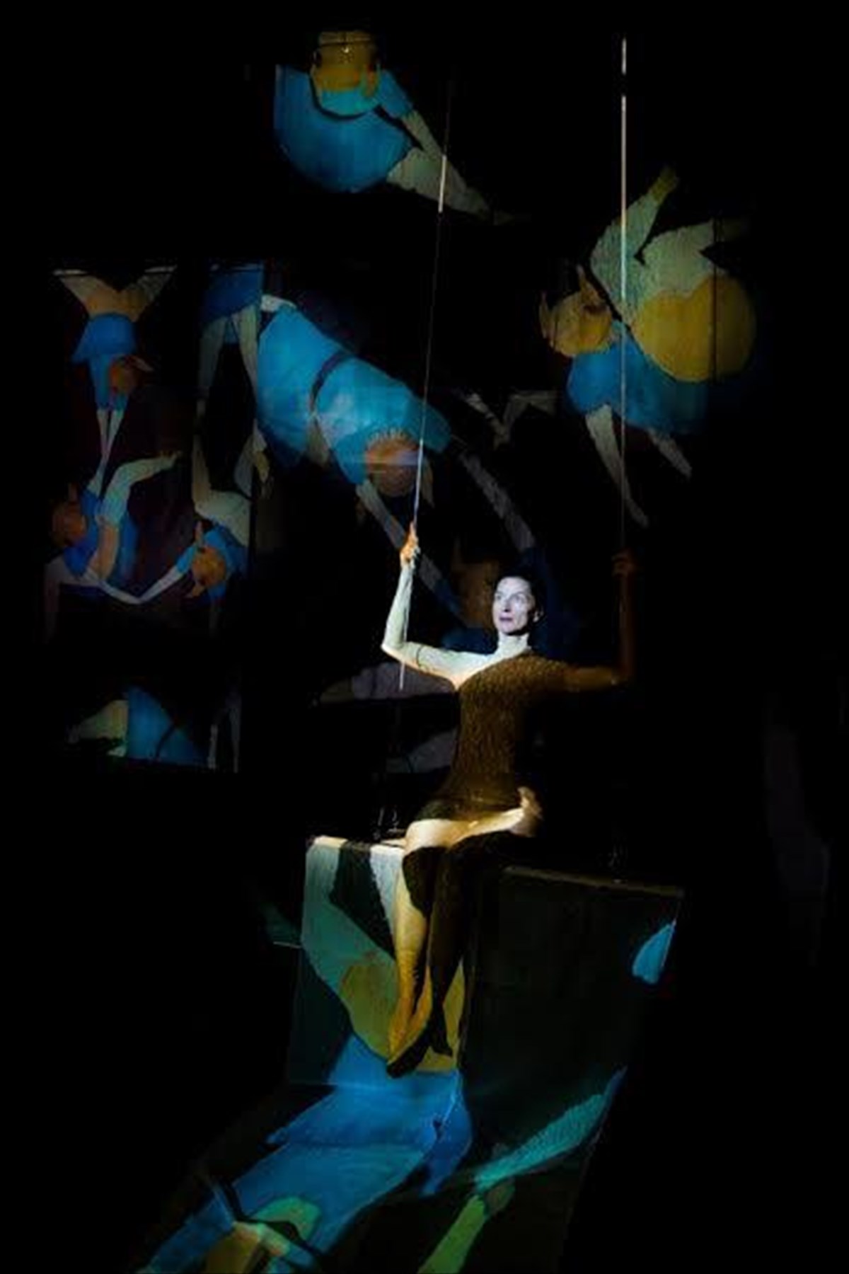 Απόλυτη σιωπή. Ύστερα ψίθυροι, μεταλλικοί ήχοι, αντήχηση. Μια γυναίκα σε μια κούνια, ακίνητη. Το κεφάλι λυγισμένο προς τα εμπρός, τα μακριά μαλλιά μπροστά στο πρόσωπο. Προβολές ζωγραφισμένων μαύρων φιγούρων κινούνται πάνω στην γυναίκα, που γίνεται η ίδια καμβάς. Μια κουρτίνα κινείται. Το κεφάλι της γυναίκας στρέφεται σε αργή κίνηση στο πλάι. Ηλεκτρονικοί ήχοι, κύματα, ηχώ. Οι μαύρες μορφές πολλαπλασιάζονται και εξαπλώνονται ξαφνικά παντού. Μετά όλα μαύρα. Και οι φιγούρες φωτεινές.