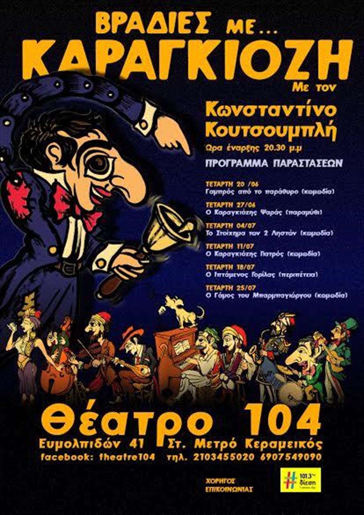 Ο Κωνσταντίνος Κουτσουμπλής παίρνει τις δερμάτινες και xαρτονένιες φιγούρες του, τα σκαλιστά και πάνινα σκηνικά του και μεταφέρει τη σκηνή του στο Θέατρο 104 στο Γκάζι. Έξι (6) διαφορετικές και συλλεκτικές περιπέτειες θα παρουσιαστούν στον μπερντέ που θα στηθεί στην αυλή του θεάτρου με φόντο τον καλοκαιρινό γαλάζιο ουρανό της Αθήνας!!!