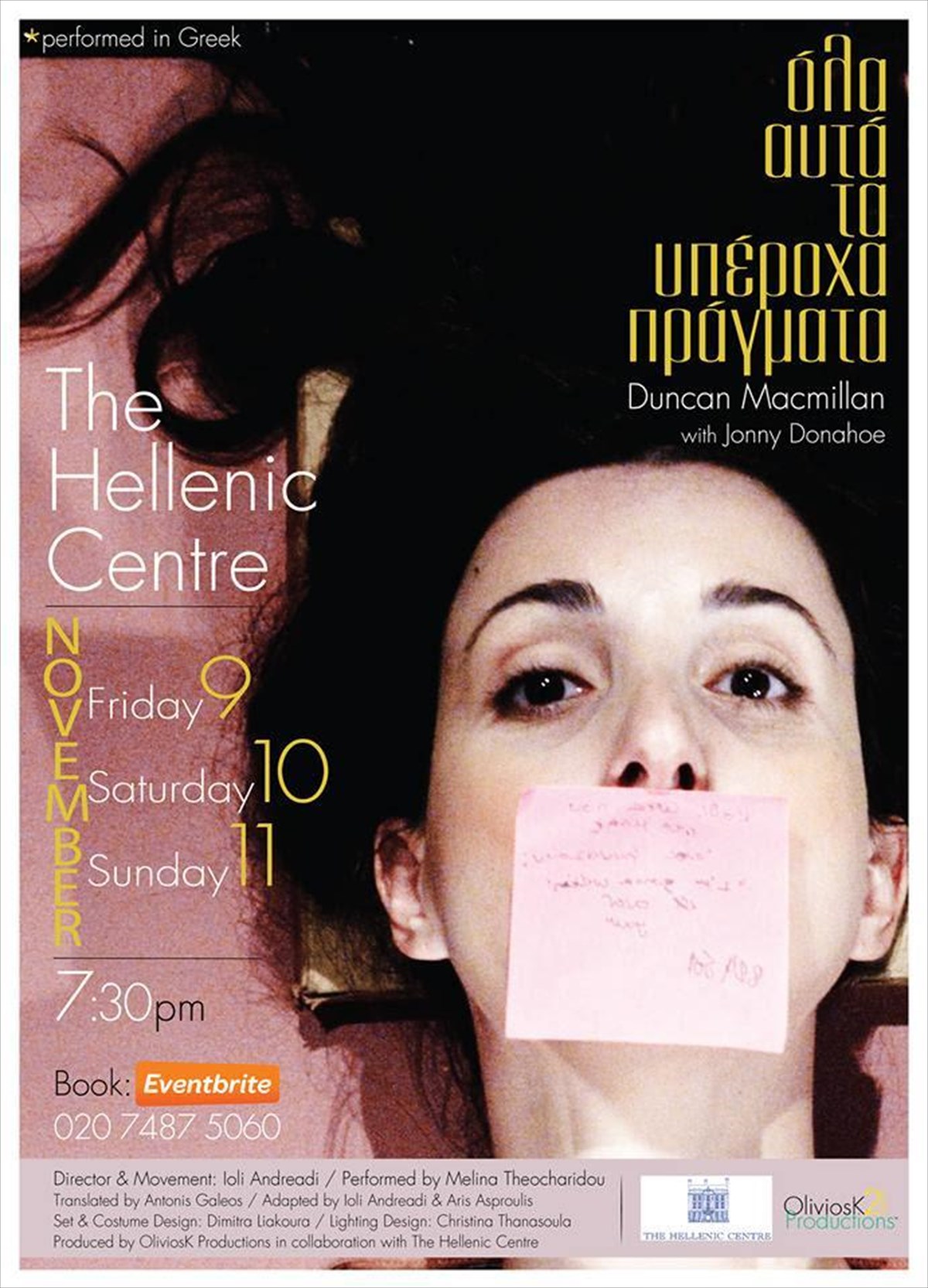 Μετά τις εξαιρετικά επιτυχημένες παραστάσεις σε Ελλάδα και Κύπρο τα τελευταία 2 χρόνια (Θέατρο του Νέου Κόσμου, Tempus Verum, Bob Festival στο πλαίσιο του Φεστιβάλ Αθηνών, sold-out περιοδεία σε Θεσσαλονίκη, Ηράκλειο, Πρέβεζα, Γιάννενα, Σύρο, Δραπετσώνα, Ρέθυμνο, Σαντορίνη, Μήλο, Χανιά και Λευκωσία), το «Όλα Αυτά τα Υπέροχα Πράγματα» των Ντάνκαν Μακμίλαν & Τζόνι Ντόναχο σε σκηνοθεσία Ιόλης Ανδρεάδη, με την ηθοποιό Μελίνα Θεοχαρίδου επί σκηνής, επιστρέφει το 2018 στον τόπο που γεννήθηκε, το Λονδίνο. Στο Hellenic Centre στις 9, 10 και 11 Νοεμβρίου.