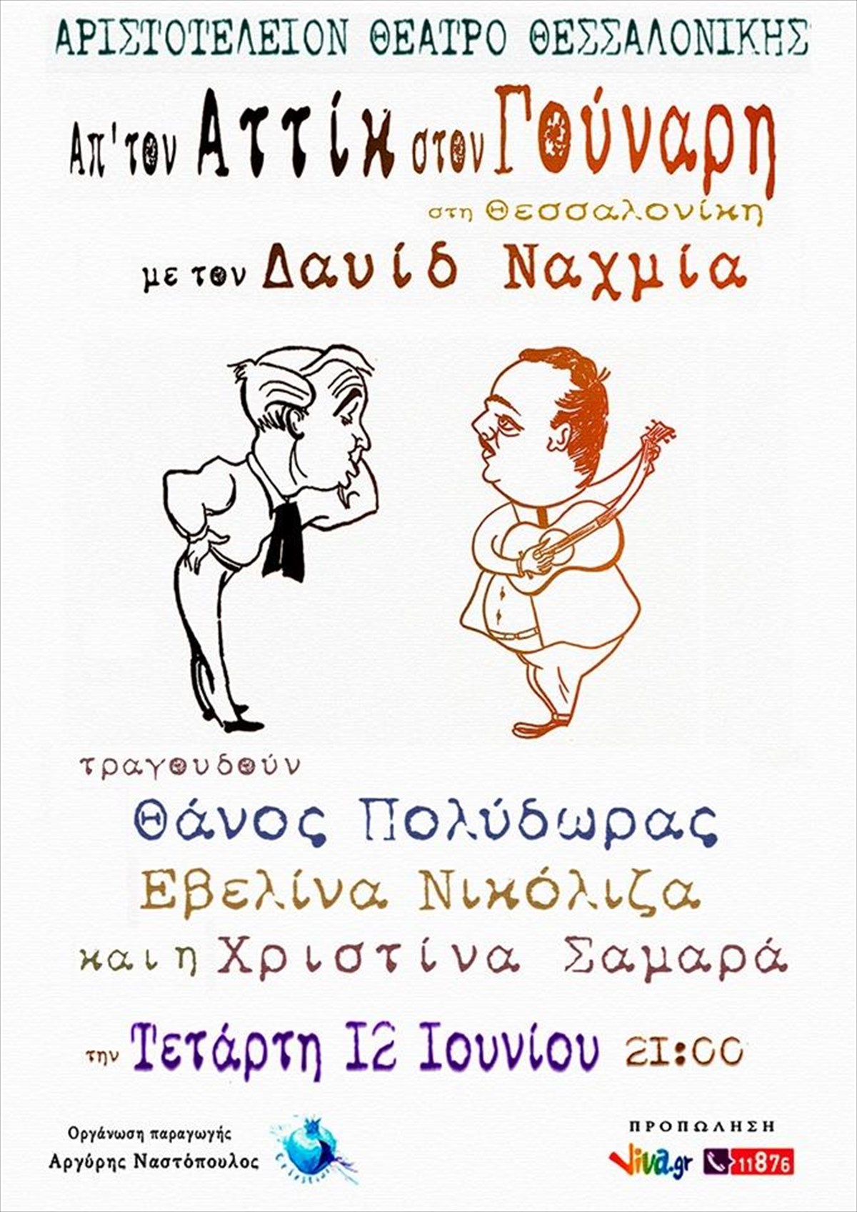 O Δαυίδ Ναχμίας παρουσιάζει για πρώτη φορά στην Θεσσαλονίκη την πιο αγαπημένη παράσταση παλιών Ελληνικών τραγουδιών “Απ’ τον Αττίκ στον Γούναρη”. Ένα ταξίδι σ’ έναν αλλιώτικο Ελληνικό γαλαξία, όπου οι άνθρωποι τραγούδαγαν μέσα απ’ την ψυχή τους για τον έρωτα και την αγάπη, για τους καημούς και τις πίκρες τους. Σουγιούλ, Γιαννίδης, Σακελλάριος, Βέμπο, Δανάη, Μαίρη Λω, Στέλλα Γκρέκα, Χαιρόπουλος, Τραϊφόρος, Πολυμέρης , Μαρούδας τραγουδούσαν για τον κόσμο που άλλαζε…για δυο πράσινα μάτια με μπλε βλεφαρίδες…για το πόσο λυπούνται τα χρόνια που πήγαν χαμένα…για το παρηγορητικό κρασάκι…για την ερωτική απόγνωση-ας ερχόσουν για λίγο κι ας χανόσουν μετά…