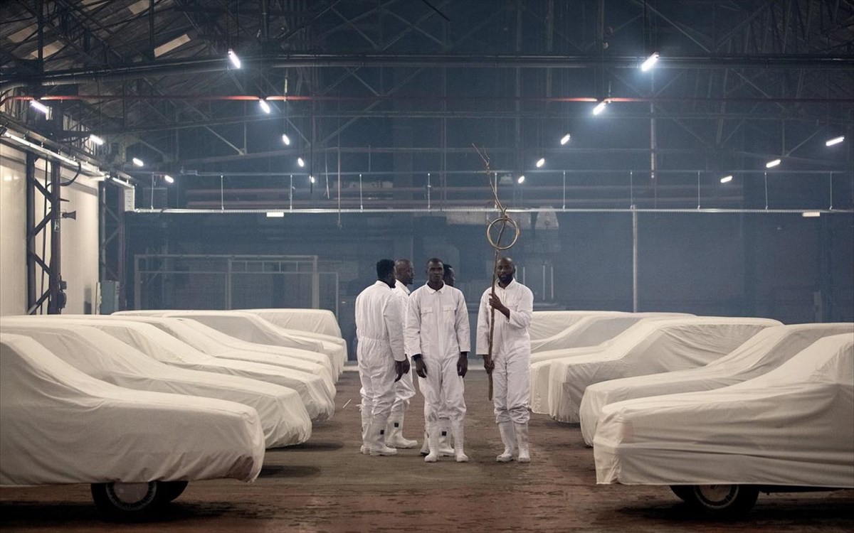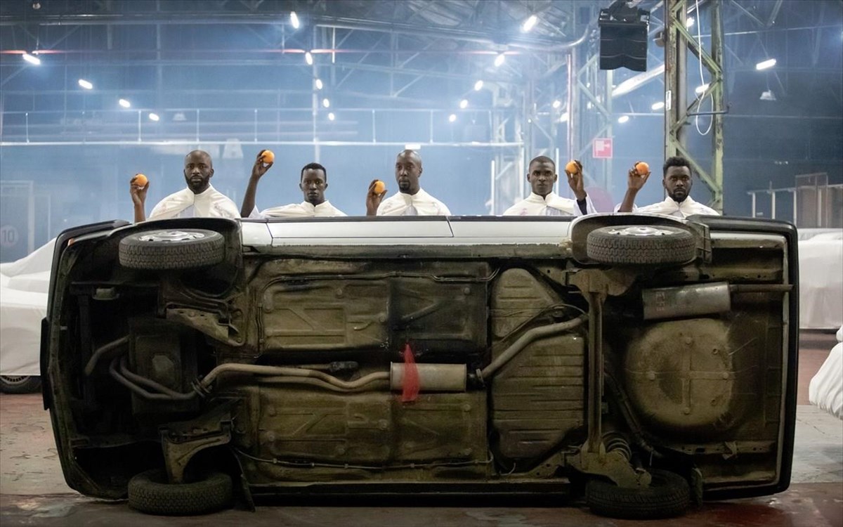 Πέντε ερασιτέχνες Αφρικανοί ηθοποιοί, πανύψηλοι, σκαρφαλωμένοι πάνω σε τακούνια και ντυμένοι με λευκά ιερατικά ενδύματα περιφέρονται για αρκετή ώρα σιωπηλά - άσκοπα θα μπορούσε να πει κανείς -στον χώρο ή μπλέκονται με τους θεατές που κάθονται οκλαδόν στο πάτωμα. Ενας διαρκής βόμβος διαπερνά τον συμπιεσμένο αέρα στοχεύοντας να υπενθυμίσει οτι εδώ συντελείται η σύγκρουση μεταξύ πραγματικότητας και φαντασίας.