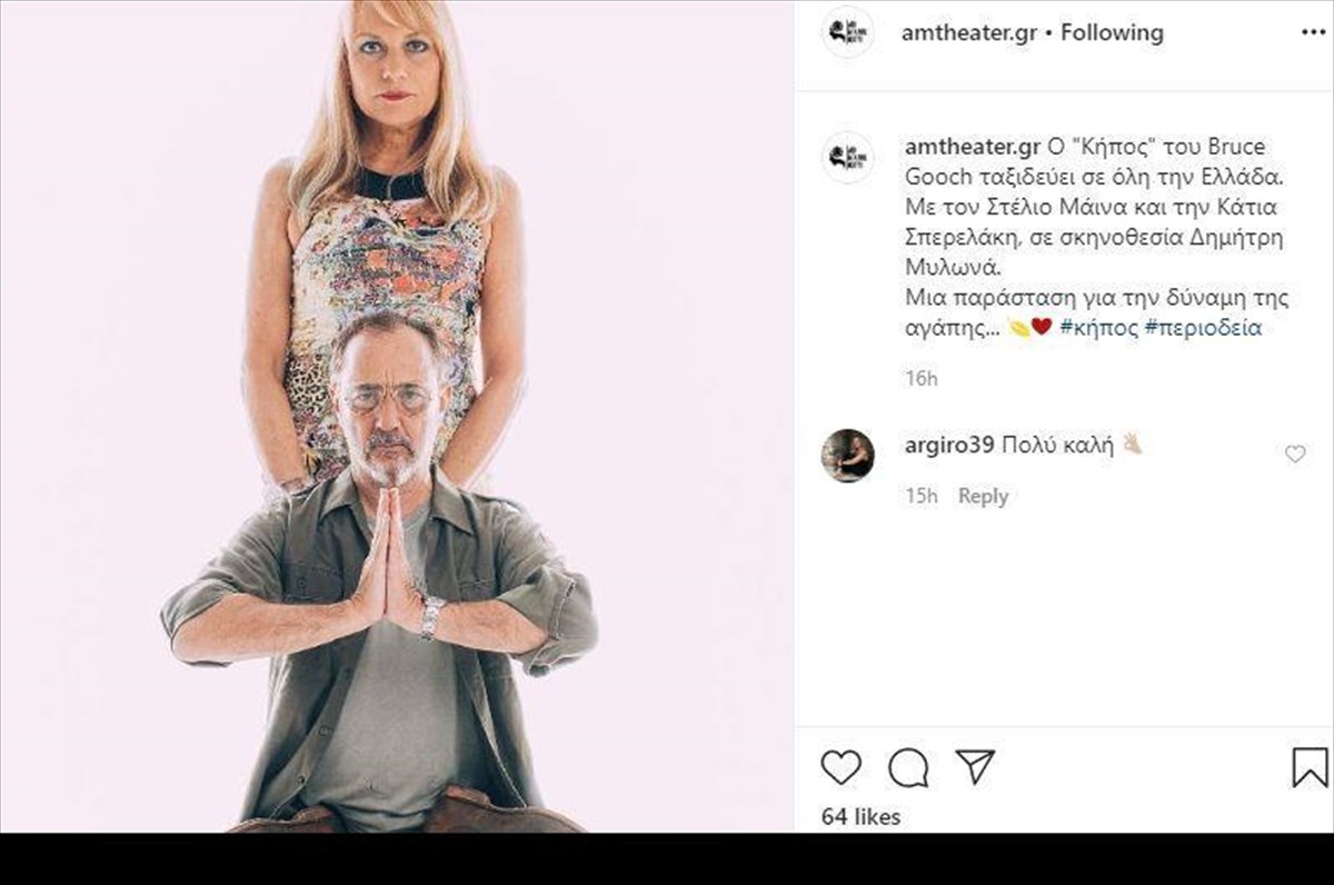 «Ο Κήπος» του διακεκριμένου Καναδού ηθοποιού και συγγραφέα Bruce Gooch έκανε την παγκόσμια πρεμιέρα του τον Οκτώβριο του 2018 στο Από Μηχανής Θέατρο σε σκηνοθεσία Δημήτρη Μυλωνά με τους Στέλιο Μάινα και Κάτια Σπερελάκη να συμπρωταγωνιστούν. Τώρα, μέσα σε αυτές τις πρωτόγνωρες καταστάσεις που ζούμε εν μέσω της πανδημικής κρίσης του κορονοϊού, ο σκηνοθέτης και ιδρυτής της θεατρικής σκηνής αποφάσισε να το επαναφέρει στο προσκήνιο.