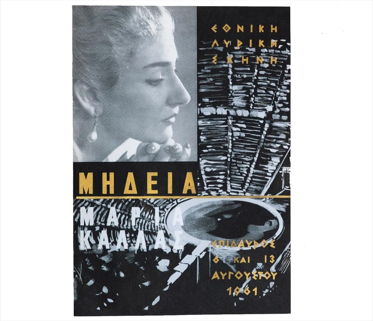 Ανατύπωση σε διάσταση αφίσας και αφισέτας του εξωφύλλου του προγράμματος της Μήδειας της ΕΛΣ του 1961 με τη Μαρία Κάλλας στο Αρχαίο Θέατρο Επιδαύρου.