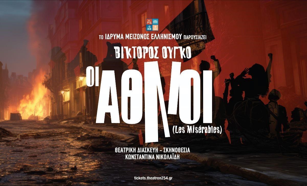 Το Ίδρυμα Μείζονος Ελληνισμού που παραδοσιακά πλέον ανεβάζει τις μεγαλύτερες και θεαματικότερες παραγωγές για μικρούς, αλλά και μεγάλους θεατές, παρουσιάζει το εμβληματικό έργο του Βίκτορος Ουγκό «Οι Άθλιοι». Μετά την τεράστια επιτυχία «Όλιβερ Τουίστ» του Καρόλου Ντίκενς, τη σκηνοθεσία και θεατρική διασκευή του δημοφιλούς αριστουργήματος του 19ου αιώνα υπογράφει η Κωνσταντίνα Νικολαΐδη, μαζί με έναν θίασο 22 καταξιωμένων και ταλαντούχων ηθοποιών.