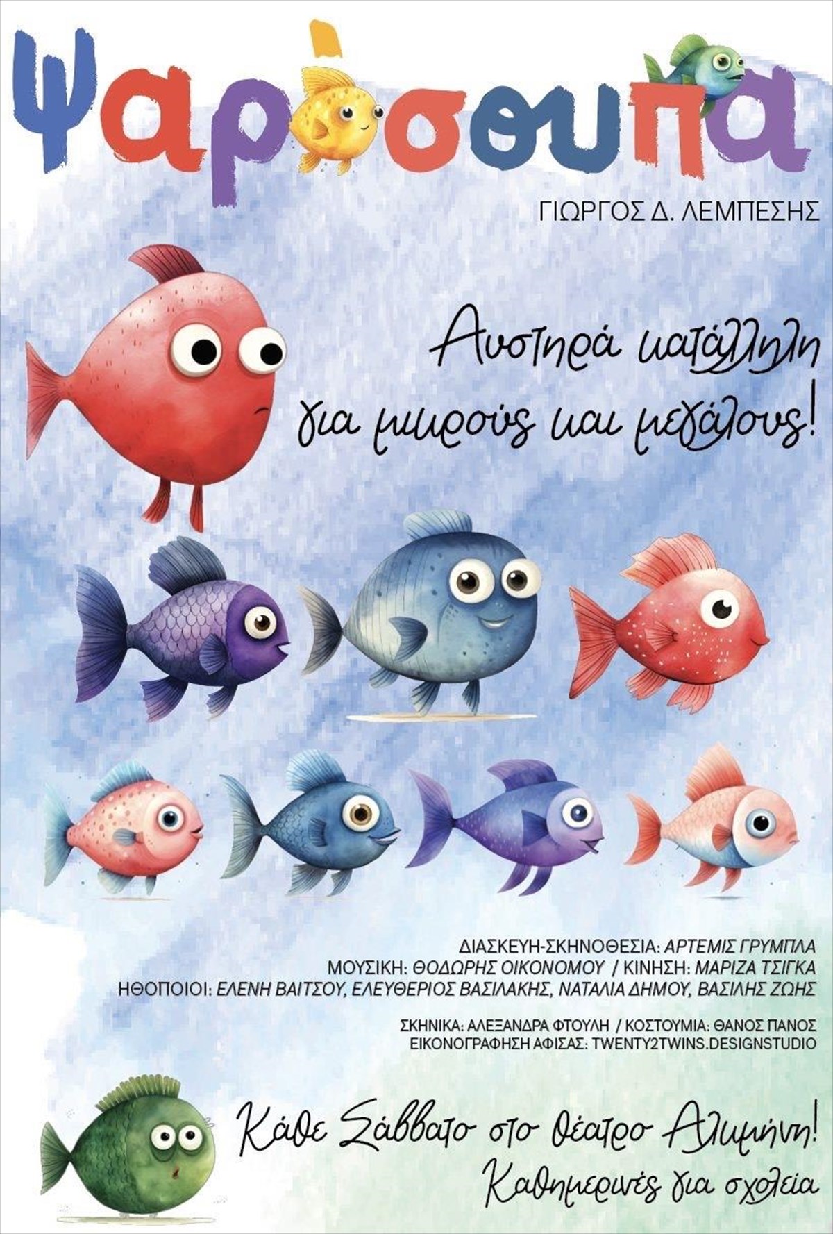 Η «Ψαρόσουπα», βασισμένη στην ομότιτλη σειρά βιβλίων – best seller για πάνω από 15 χρόνια, του Γιώργου Δ. Λεμπέση, ζωντανεύει στη σκηνή του Θεάτρου Αλκμήνη σε σκηνοθεσία της Άρτεμις Γρύμπλα και σας προσκαλεί σε έναν κόσμο μαγικό, γεμάτο χρώματα, μουσικές και σημαντικά μηνύματα.