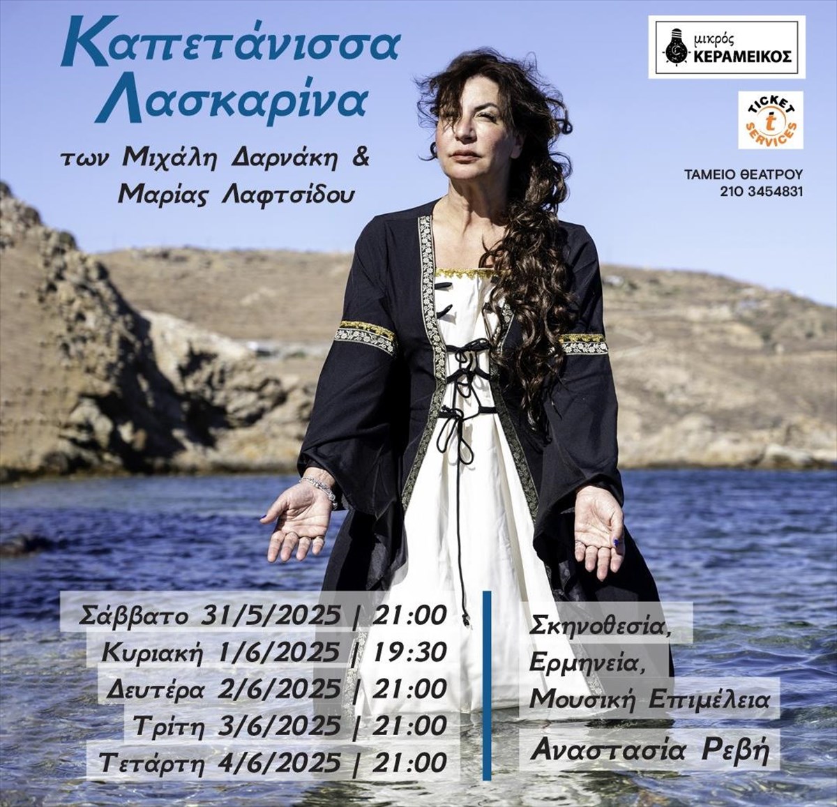 Η Εταιρεία Παραγωγής Theatre Lab Company, με έδρα το Λονδίνο, παρουσιάζει το θεατρικό έργο «Καπετάνισσα Λασκαρίνα» σε κείμενο των Μιχάλη Δαρνάκη και Μαρίας Λαφτσίδου και σε σκηνοθεσία και ερμηνεία της Αναστασίας Ρεβή στο Θέατρο Μικρός Κεραμεικός από τις 31 Μάϊου έως τις 4 Ιουνίου, για 5 μόνο παραστάσεις.