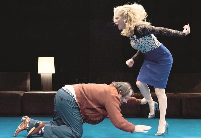 Ο σκηνοθέτης Ακύλας Καραζήσης στην παράσταση που έστησε πάνω στο εξαιρετικά δύσκολο υλικό που του δόθηκε (στη Νέα Σκηνή του Εθνικου Θεάτρου) τράβηξε τις καταστάσεις και τους χαρακτήρες στα άκρα. Λύση που απέδωσε. Η Μαρία Σκουλά είναι μια υστερική σκύλα που σφάζεται ανηλεώς με τον κατατονικό σύζυγό της Κωνσταντίνο Αβαρικίωτη στη πρώτη σκηνή. Ακόμη τίποτα δεν διαφαίνεται, όμως, τίποτα δεν προδίδει ούτε καν ως υποψία αυτό που έρχεται. Εξίσου φωνασκούντες είναι και οι υπόλοιποι ήρωες που τρώγονται με το σκηνικό έτερο ήμισύ τους (εμφανίζονται στις σκηνές ανά δυάδες, μέχρι την τελική σύνθεση) διατρέχοντας το μακρόστενο διάδρομο (lobby ξενοδοχείου ή αίθουσα αναμονής αεροδρομιού; Η αισθητική πάντως κοπιαρισμένη από ταινίες του Λάνθιμου). Στο αδιευκρίνιστο αυτό τεταμένο σύμπαν με τους ανθρώπινους δεσμούς σε αποσύνθεση ( μάνας και κόρης, αδελφών, συζύγων)τα πάντα ξεδιαλύνονται όταν πρέπει να ειπωθεί το τελευταίο αντίο, στο κατευόδιο για τον Αλλο κόσμο. Τα οκτώ πρόσωπα που πρωτογνωρίσαμε ανά ζεύγη συναντώνται πια ομαδικά και πρέπει να διευθετήσουν τους ανοικτούς λογαριασμούς τους. Τότε μαθαίνουμε ότι η φωνακλού σύζυγος έχει δολοφονηθεί από το σύζυγό της επειδή τον απατούσε, μαζί με όλα τα αποτρόποια κι απάνθρωπα που διαμείφθηκαν στην επίγεια κόλαση.