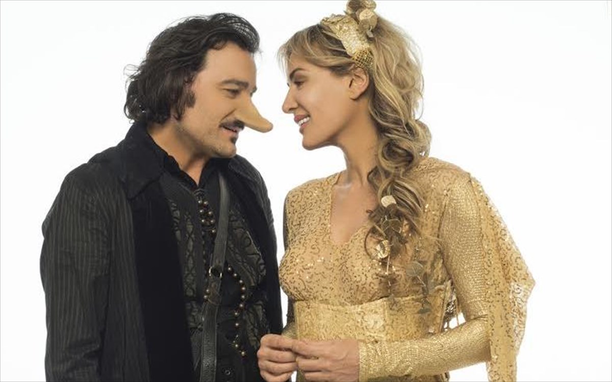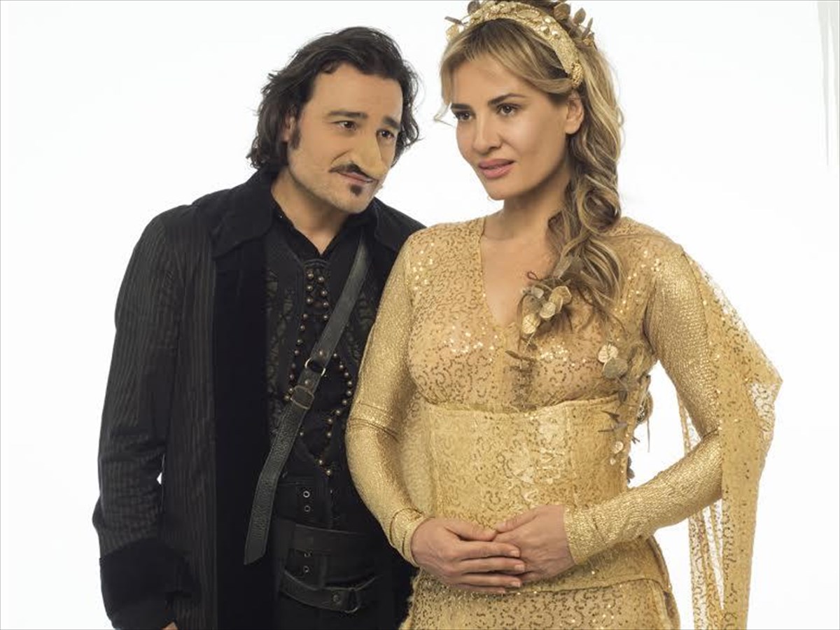 Ο Βασίλης Χαραλαμπόπουλος ενσαρκώνει τον εκκεντρικό ήρωα με τη διάσημη μύτη και την πολυσχιδή προσωπικότητα, έναν ξεχωριστό, πολυτάλαντο άνθρωπο, τρυφερό, αστείο, ποιητή, δεινό ξιφομάχο και κατ’ εξοχήν τραγικό πρόσωπο, που θα παραδεχτεί τον μεγάλο του έρωτα για την ξαδέλφη του Ρωξάνη μόνο λίγο προτού ξεψυχήσει.