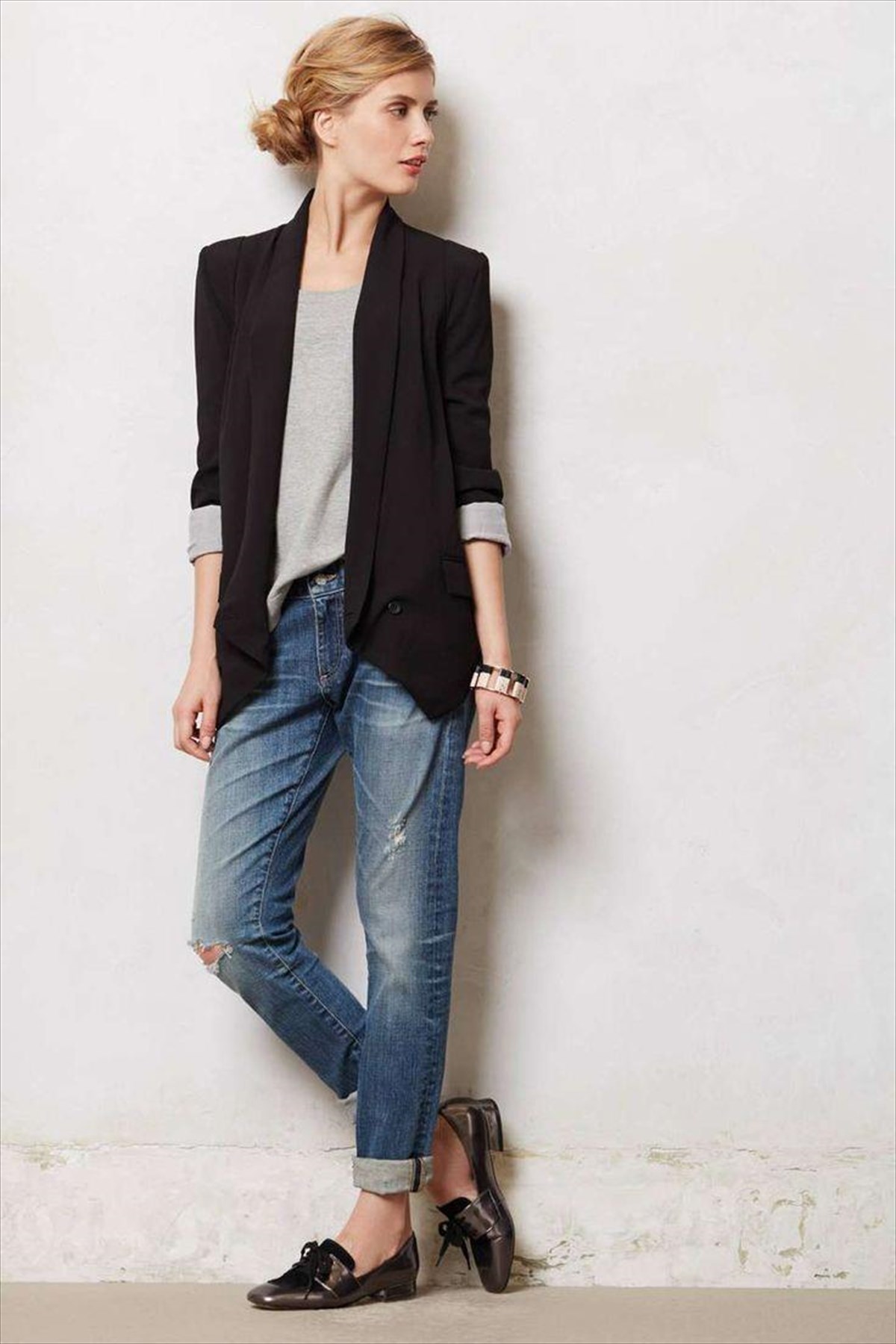 Το φανταζόμαστε στο σήμερα με λευκό παντελόνι και μπλούζα. Η αντίθεση του λευκού με το μαύρο πάντα κάτι προσθέτει. Ή λευκό σακάκι με μαύρο. Στην περίπτωση που έχουμε βαρεθεί την μονοχρωμία του μαύρου.