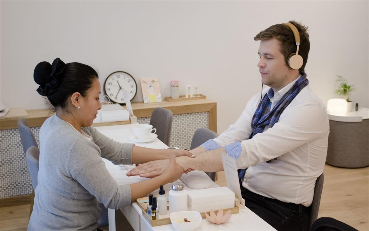 Ενδιαφέρον ακούγεται. Σίγουρα καλύτερα από το να λες ή να ακούς την ιστορία της ζωής σου, της κοπέλας που σε περιποιείται, της κυρίας απέναντι ή της διπλανής σου. Οχτώ λεπτά αρκούν για να χαλαρώσει το μυαλό και η ψυχή σου, αρχικά με καθοδήγηση. Οι οδηγίες δίνονται μέσα από τα ακουστικά που φοράς, καθώς τα νύχια σου βάφονται και τελειοποιούνται.