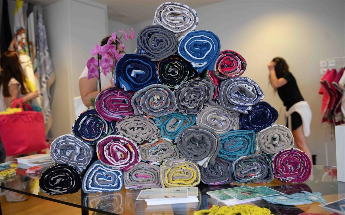 από ψηλά, δημοσιογράφοι, μπλόγκερ, σχεδιαστές, φωτογράφοι, φίλοι και γνωστοί, είδαμε από κοντά τις beach chic πετσέτες παραλίας, μονόχρωμες από τη μία, με μια αποκάλυψη-εικόνα από την άλλη, φόντο γκράφιτι στον τοίχο για την αντίθεση, για να νιώσουμε πόσο χρωματιστό μπορεί να είναι το ελληνικό καλοκαίρι.