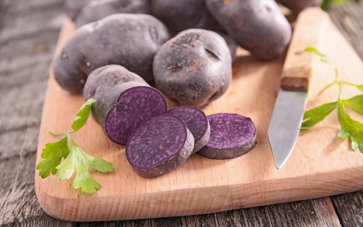 Μοβ πατάτα: Βοηθά στη μείωση της αρτηριακής πίεσης, κρατά την κυκλοφορία του αίματος σε υγιή επίπεδα και μπορεί να χρησιμοποιηθεί σαν φυσική βαφή (π.χ. για να βάψετε αυγά το Πάσχα). Έχει ήπια γεύση, γι’ αυτό συνδυάστε τη με πολλά μπαχαρικά και άλλα υλικά.
