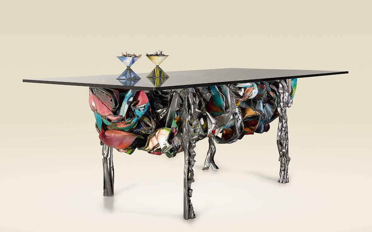 Υπάρχουν και σούπερ κιτς και υπερβολικές λύσεις που αποδεικνύουν πως τελικά ζούμε σε ένα …material world, ειδικά αν παρατηρήσουμε το πολύχρωμο τραπέζι του John Chamberlain, τα λούτρινα ζωάκια που συνθέτουν το πρωτότυπο σκαμπό των δημοφιλών και επίκαιρων πάντα Fernando και Humberto Campana…