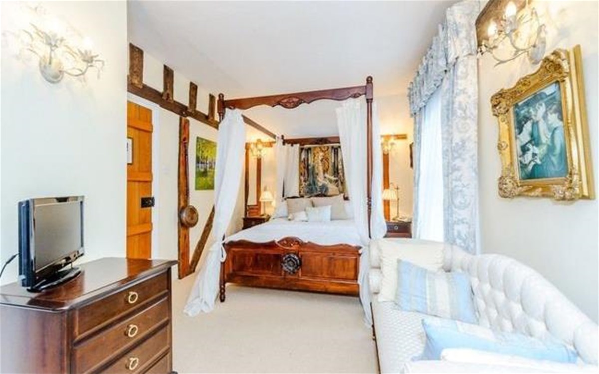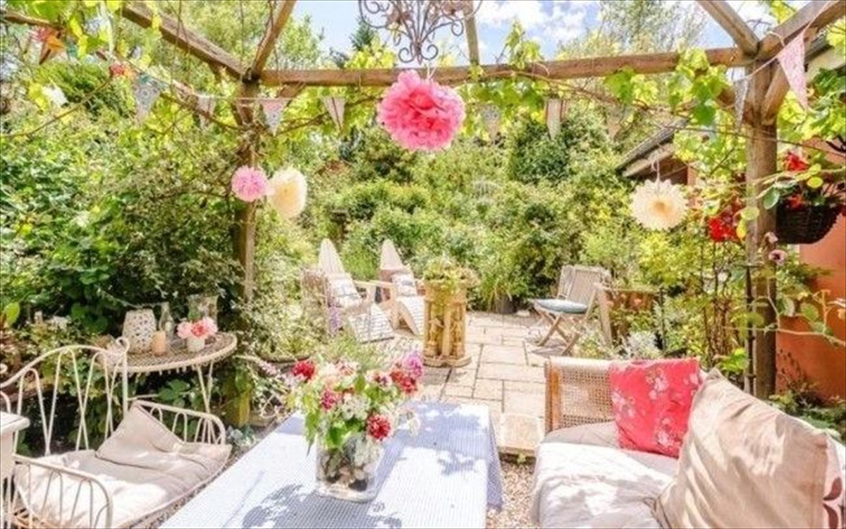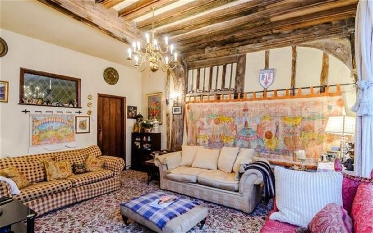 Κιτς λεπτομέρειες, διαφορετικά εμπριμέ, λευκοί τοίχοι, χαλαρή αισθητική, χτιστό τζάκι, παράθυρα και κουρτίνες εποχής, έξι συνολικά κρεβατοκάμαρες και τέσσερα μπάνια, μαζί με έναν πελώριο κήπο.