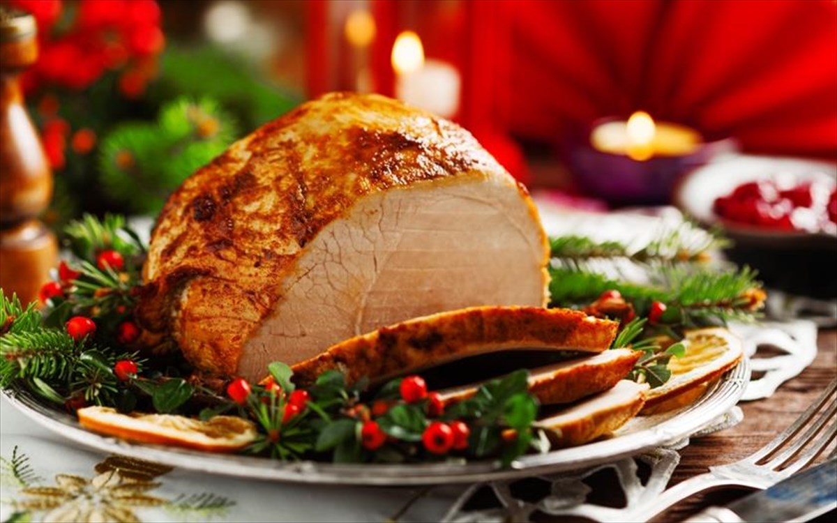 Στολίστε το χοιρινό σας με ρόδι και πράσινα κλωναράκια χριστουγεννιάτικου δέντρου. Εναλλακτικά, χρησιμοποιήστε δεντρολίβανο.