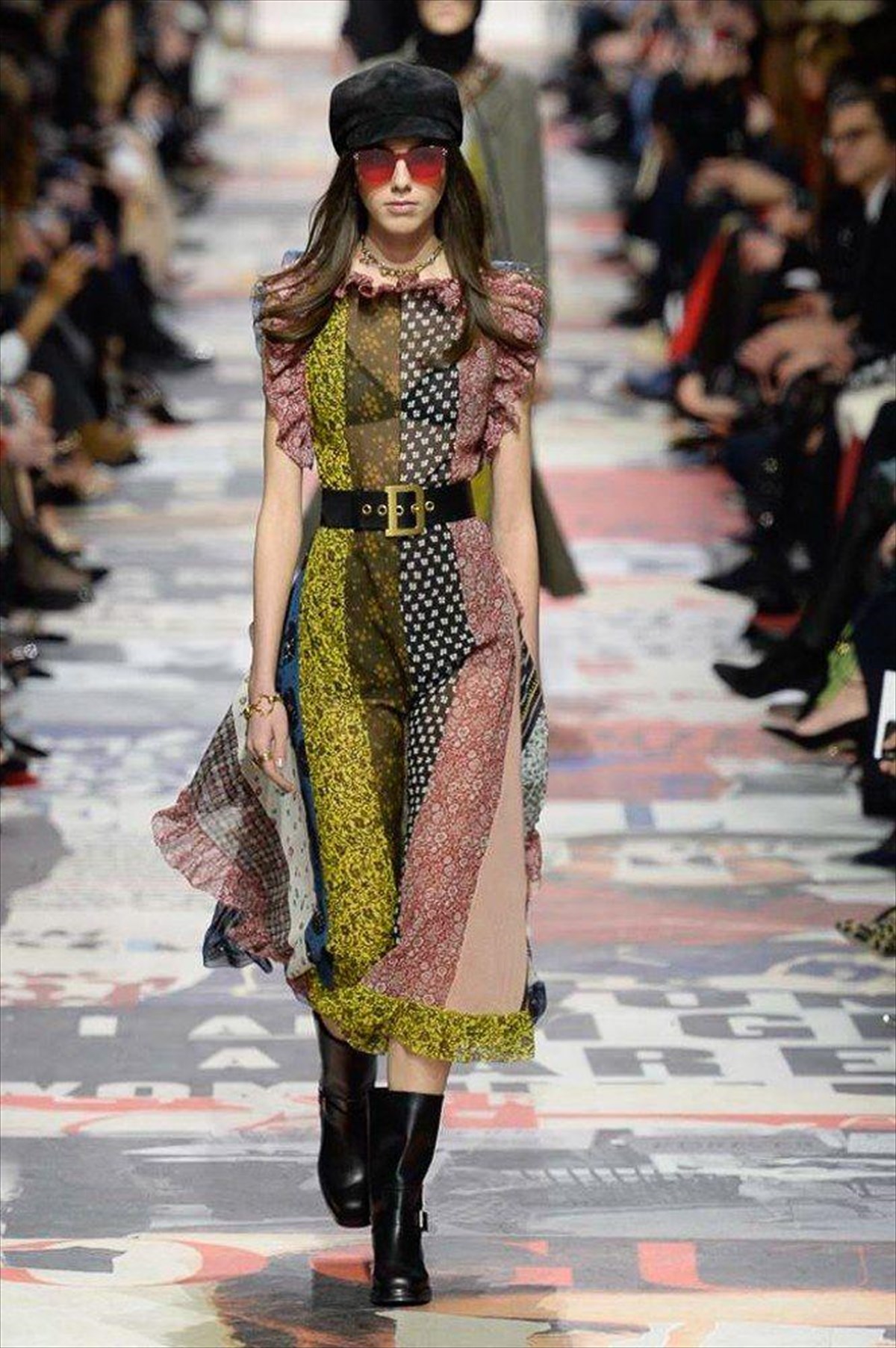 Για να μην ξεχάσουμε και τα «σύνεργα», δηλαδή, τα απαραίτητα αξεσουάρ ενός επαναστατικού κινήματος μόδας, μαζί με όλα τα κλισέ: καπέλα, μπερεδάκια, σαμπό, μαύρες μπότες, αυστηρές γραμμές, φούστες παρέλασης. Κάτι με το οποίο μπορείς να διανύσεις χιλιόμετρα…Ακόμη και οι τσάντες που είχαν δεμένες στη μέση τους τα κορίτσια, είχαν γυρίσει, σα να τις είχε κάποιος παρασύρει μέσα στον όχλο… Dior επαναστάτριες. Μήπως να έδιναν και τίποτα για καλό σκοπό;