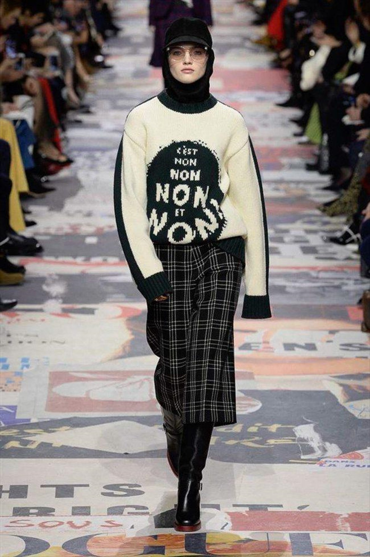 Και ποιο είναι το μήνυμα σήμερα; Ένα τεράστιο όχι, γραμμένο ξανά και ξανά, (εννοείται στα γαλλικά), σε ασπρόμαυρα πουλόβερ. Αν είναι να αντισταθείς, κάντο με πολυτέλεια.
