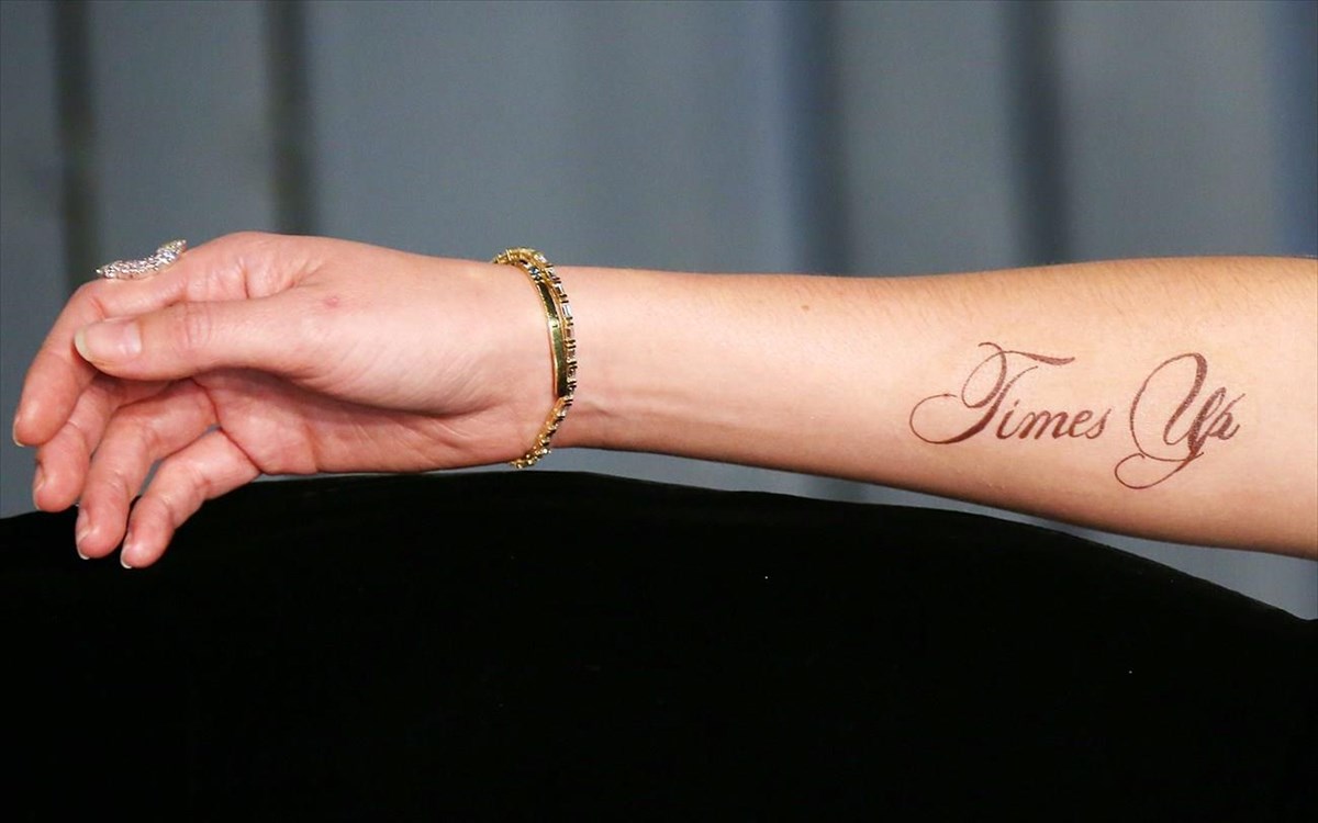 Το τατουάζ της Emma Watson δεν είναι διακριτικό, είναι γραμμένο με καλλιγραφικά γράμματα στο δεξί της χέρι και ταιριάζει τέλεια με το φόρεμα, και τα χρυσά κοσμήματα.