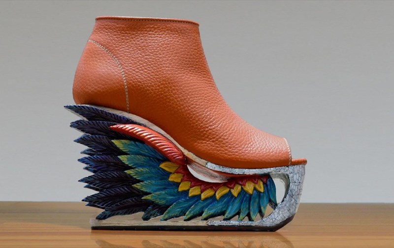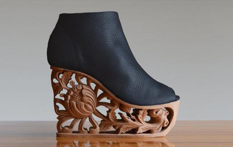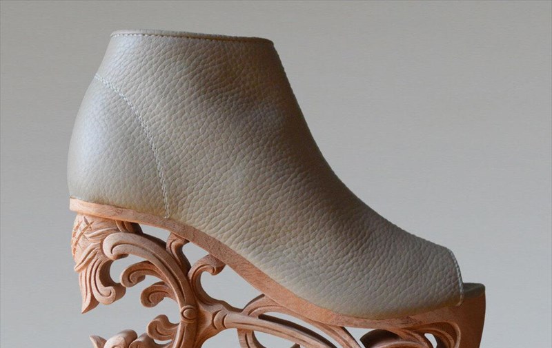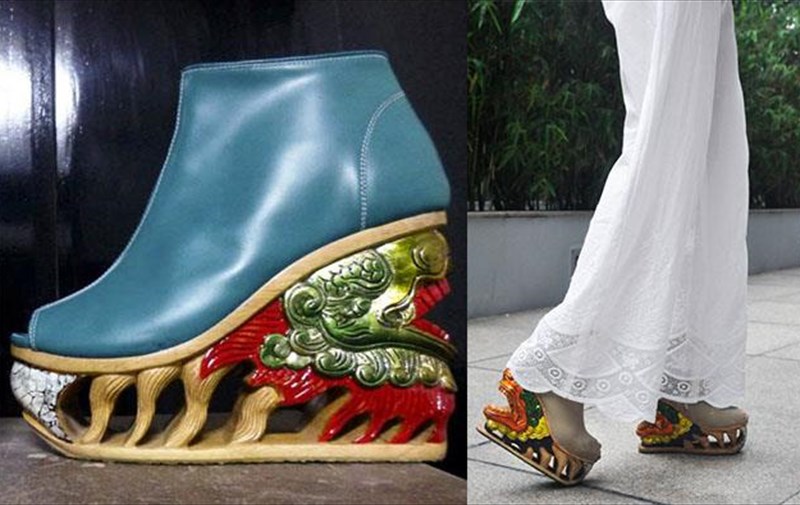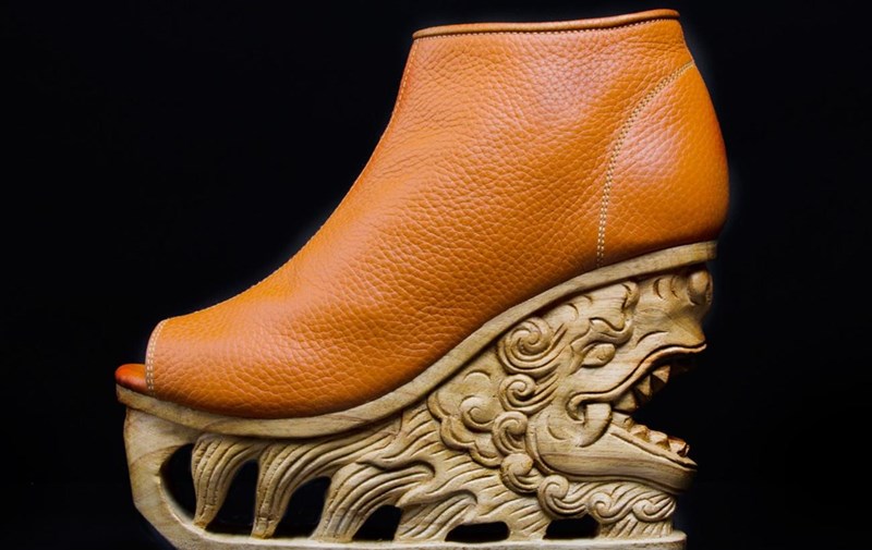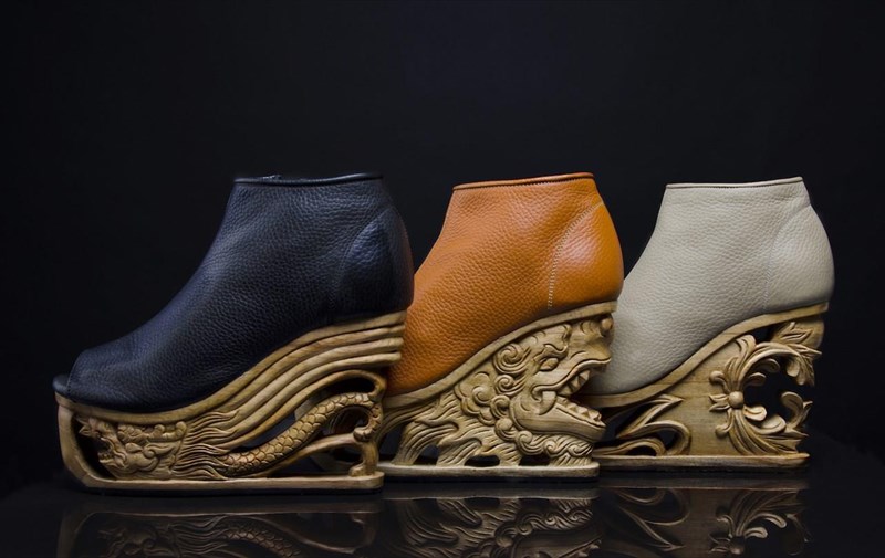 Θα δούμε και τα πιο πρωτότυπα παπούτσια, με αρχαιοελληνικές αναφορές. Φανταστείτε κάτι σαν σύγχρονους κοθόρνους, με δέρμα και ξύλινα γλυπτά που φέρουν ευφάνταστες ονομασίες όπως χρυσάνθεμα, αλλά και πλατφόρμες που καταλήγουν σε κύμα ή άλογο.