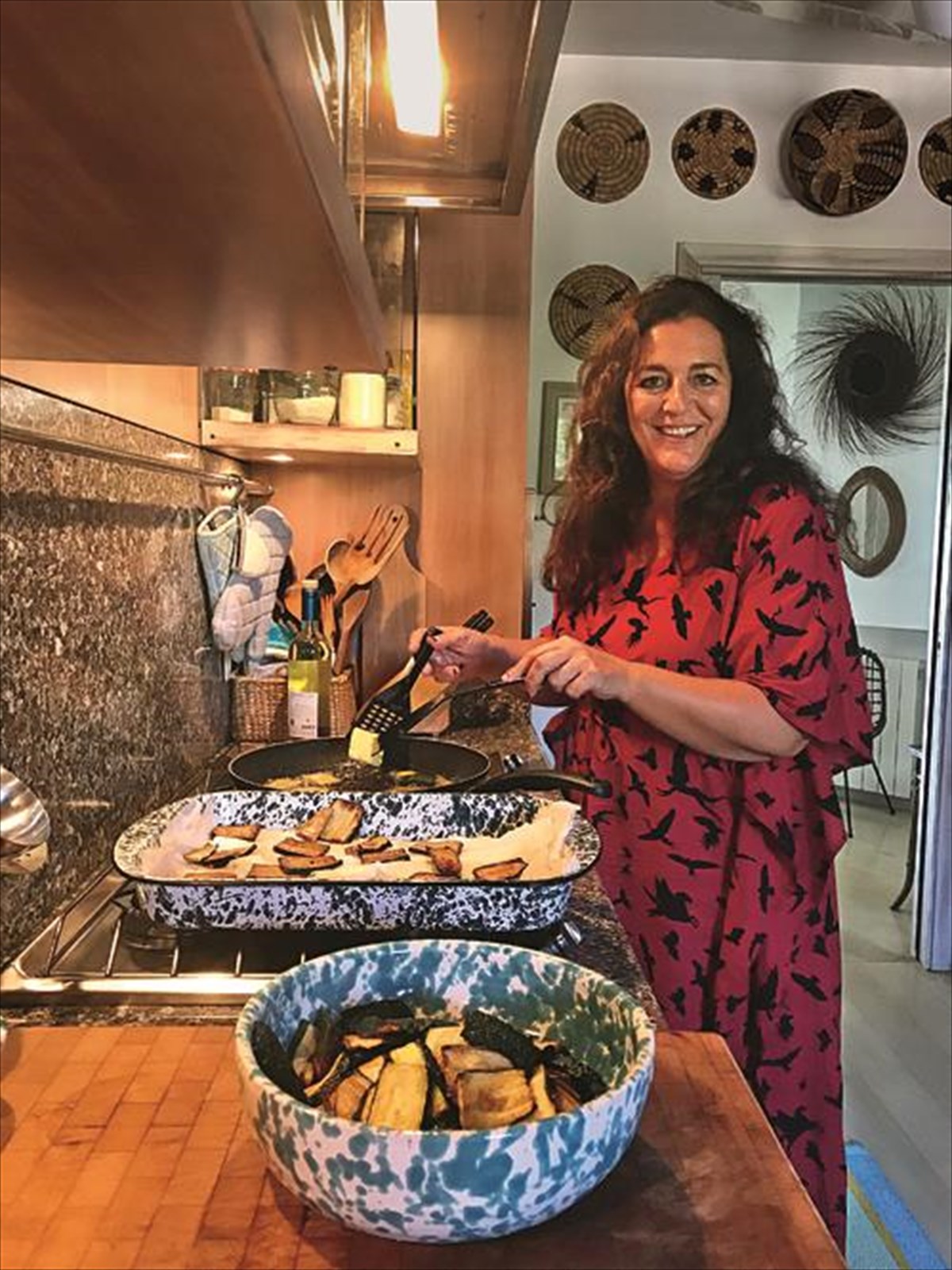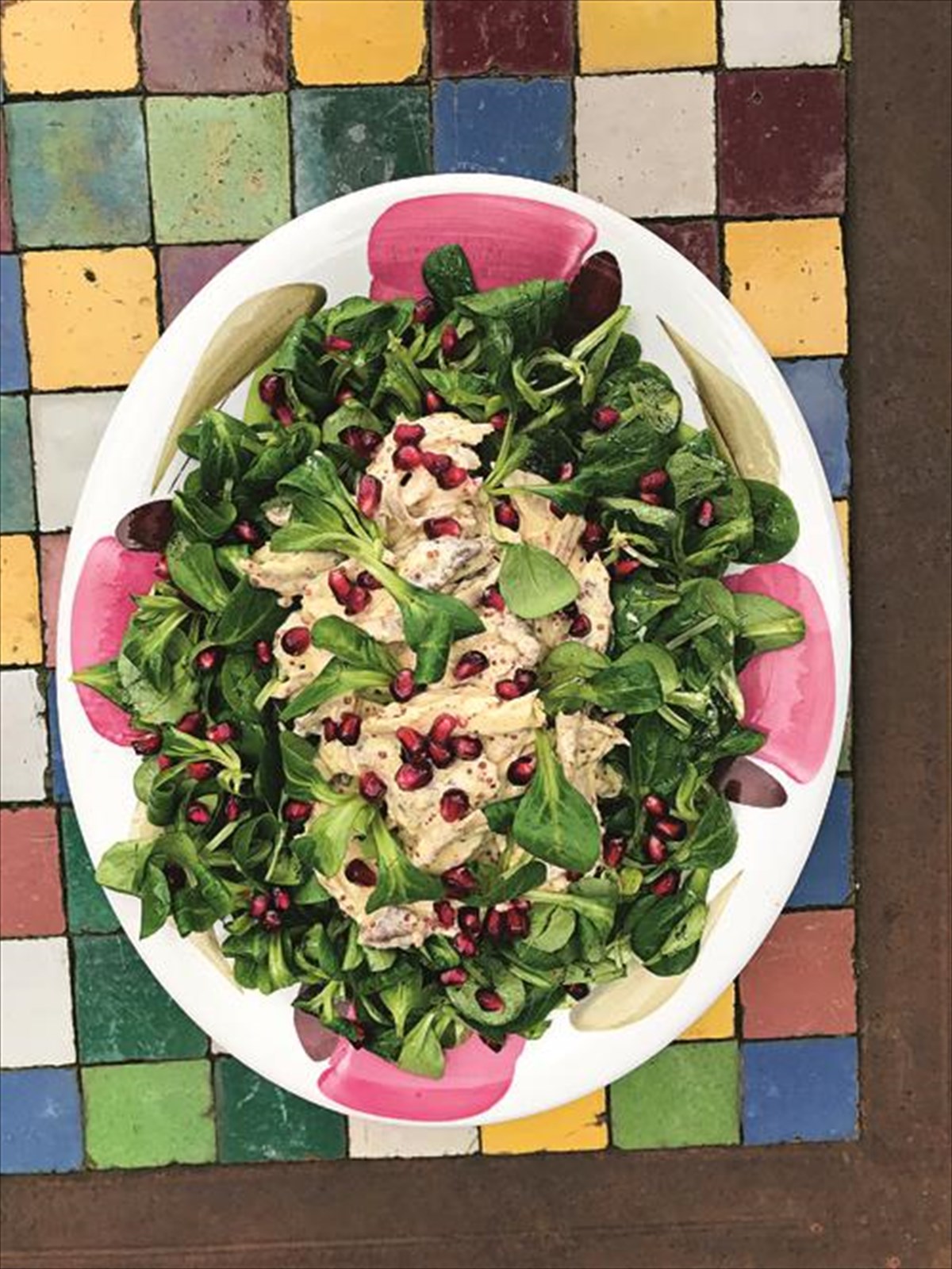 Κάπως έτσι βλέπεις όμορφα πιάτα σε λευκό και κόκκινο, μπλε και πράζινο τραπεζομάντηλο, κόκκινα μπολ για τη φρουτοσαλάτα, φούξια και λαχανί πιατέλα για τη σαλάτα με το ρόδι, έκρηξη χρωμάτων και συναισθημάτων από την κουζίνα στην τραπεζαρία.