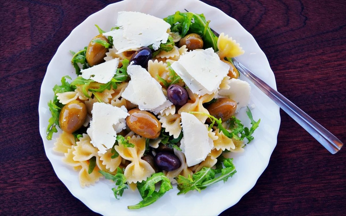 500 γρ. φιογκάκια φαρφάλες, 300γρ. TREA Γαϊδουροελιές με θαλασσινό αλάτι, 2 φγ. ρόκα, 100 γρ. φέτα σε λεπτά κομμάτια, 300γρ. TREA Ελιές Καλαμών με θαλασσινό αλάτι, 3 κ.σ. TREA Εξαιρετικό Παρθένο Ελαιόλαδο - Κορωνέικη, αλάτι, πιπέρι.