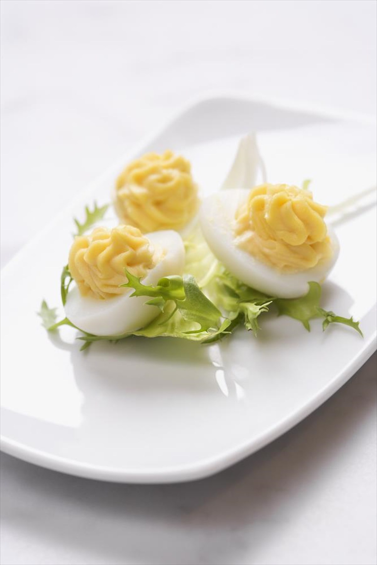 Κόψτε τα αυγά σας στη μέση κατά μήκος. Βγάλτε τους κρόκους τους και λιώστε τους με ένα πιρούνι. Ανακατέψτε τους με μαγιονέζα, μουστάρδα, αλάτι και πιπέρι και έπειτα προσθέστε το μείγμα σας στη θέση του κρόκου που αφαιρέσατε. Καλύψτε και βάλτε τα στο ψυγείο για 24 ώρες.