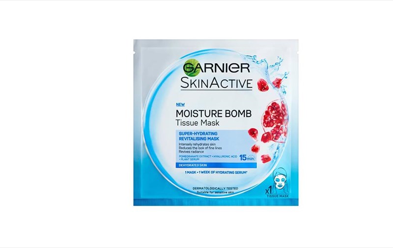 -Skin Active Moisture Bomb Mask, Garnier: Υφασμάτινη μάσκα ενυδάτωσης εμπλουτισμένη με εκχυλίσματα ροδιού, υαλουρονικό οξύ και ενυδατικό serum. Ενυδατώνει την επιδερμίδα εντατικά, μειώνει τις ρυτίδες και επαναφέρει την χαμένη λάμψη της επιδερμίδας.