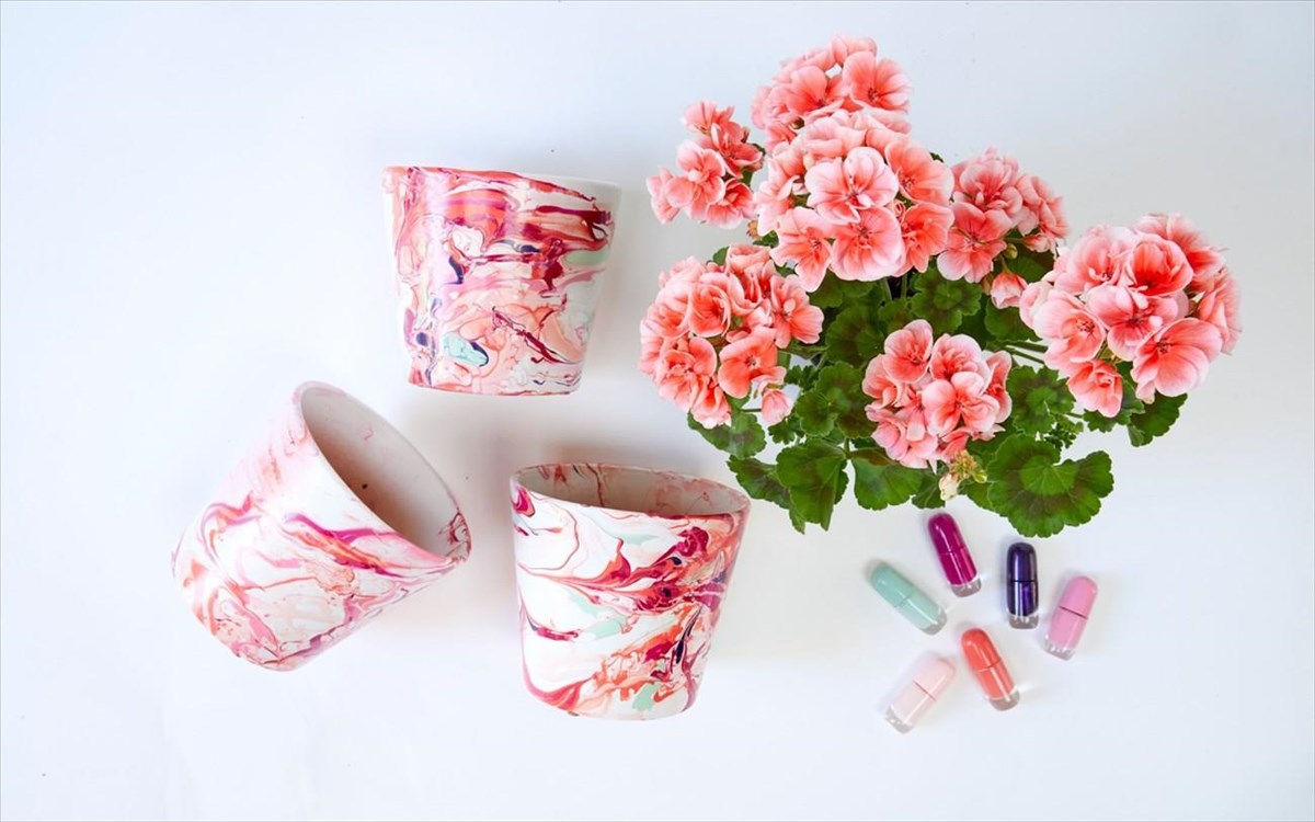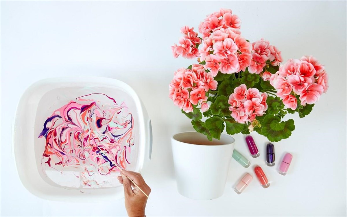 Αναβαθμίστε τις απλές γλάστρες στο μπαλκόνι σας! Ένα βερνίκι νυχιών μεταμορφώνει τις λευκές γλάστρες σε ένα κομψό αξεσουάρ, τέλειο για τα πολύχρωμα γεράνια, σε ένα γρήγορο και εύκολο DIY έργο. Το μόνο που χρειάζεστε είναι κασπώ σε λευκό χρώμα, βερνίκια σε διαφορετικά χρώματα της αρεσκείας σας, ξύλινα καλαμάκια για το ανακάτεμα και ένα μεγάλο μπολ ή δοχείο με νερό.