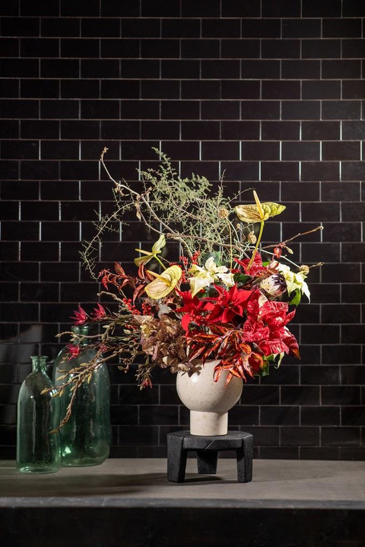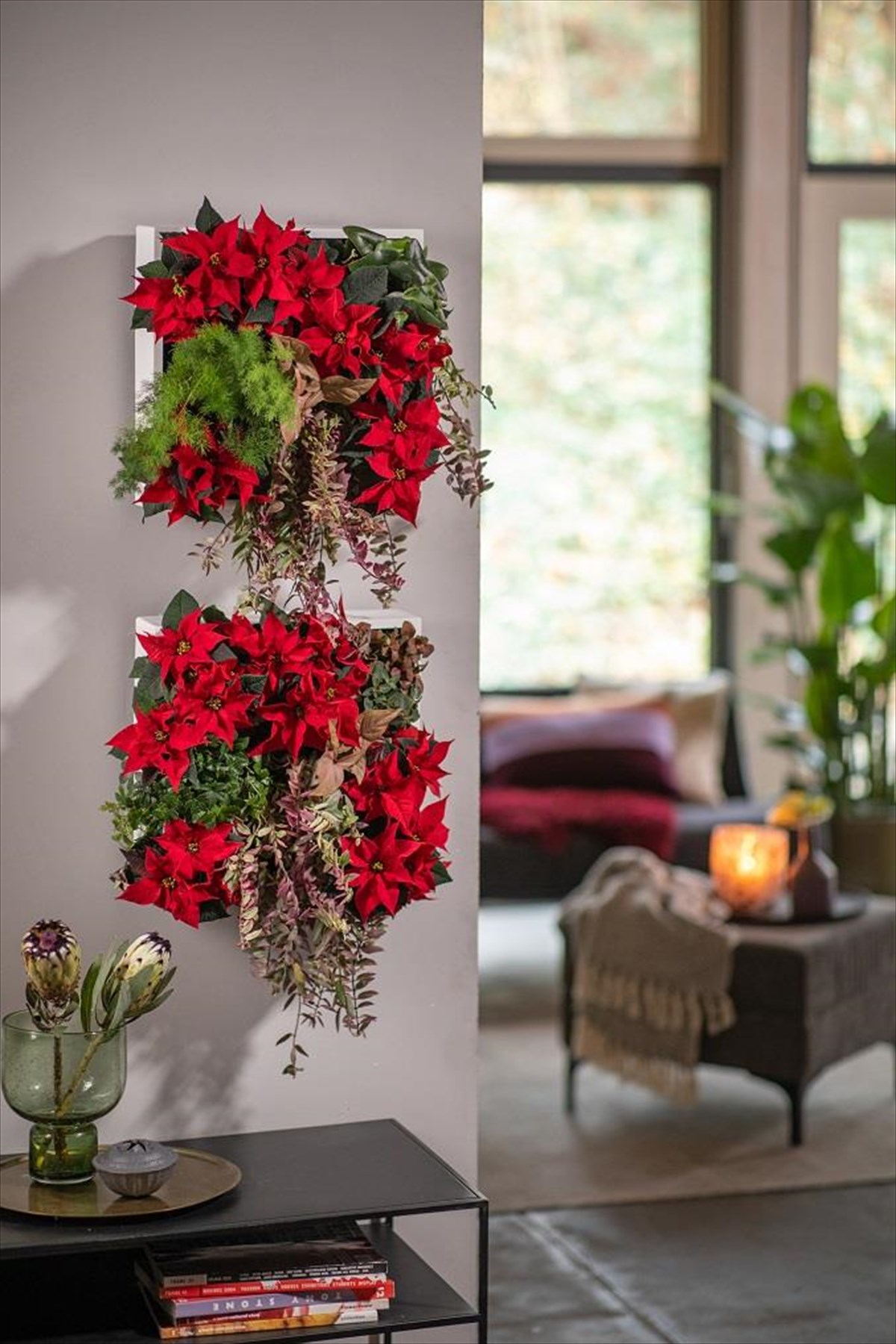 Μια εντυπωσιακή επιτοίχια σύνθεση παντρεύει αλεξανδρινά με φυλλώδη φυτά και μεταμορφώνεται σε ένα «ζωντανό» έργο τέχνης. Αυτή η ευφάνταστη σύνθεση περιλαμβάνει ζωηρά κόκκινα αλεξανδρινά, φυτώνια, συγκόνια, το φυτό τηλέγραφο, καλλωπιστικά σπαρράγγια, παρθενοκισσό και το φυτό χειμωνίτη.