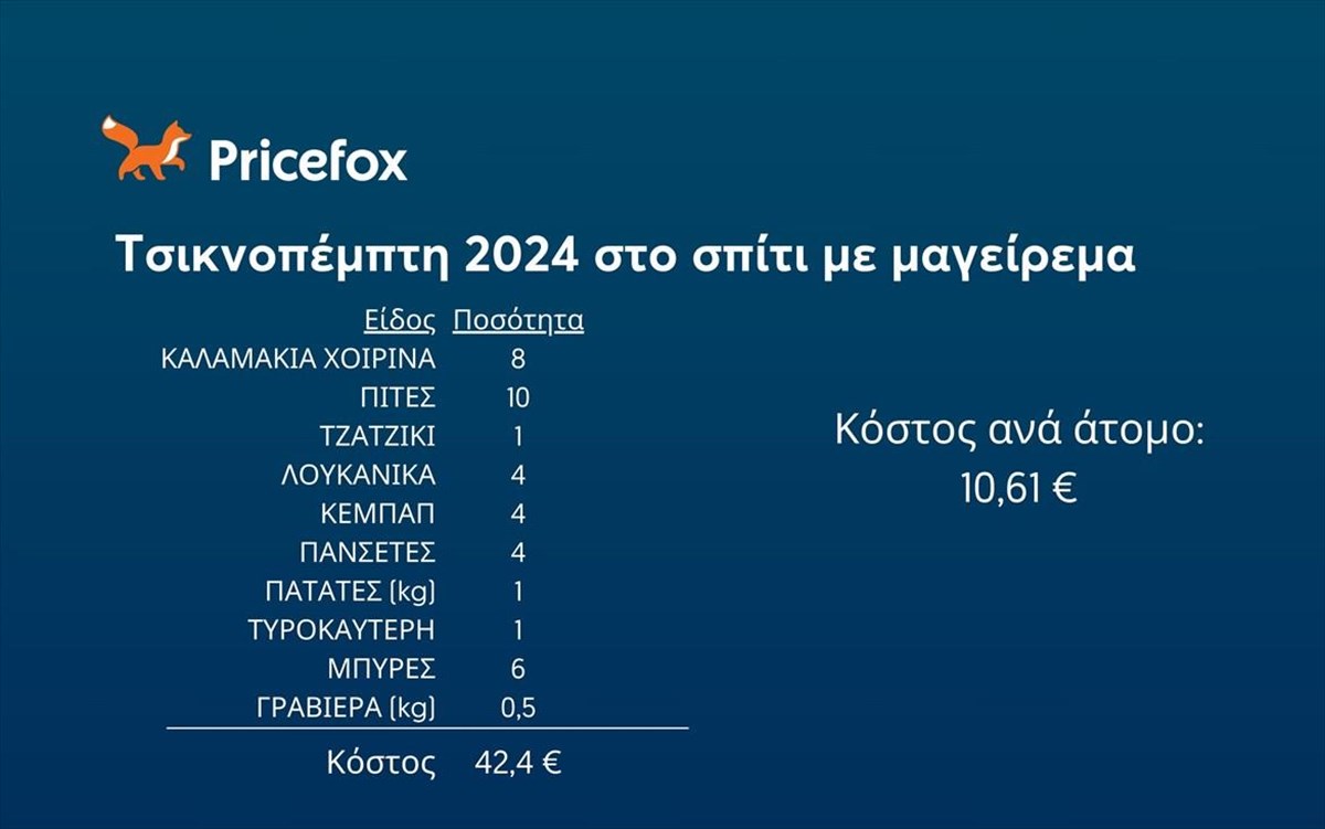 Βρισκόμαστε σε απόσταση αναπνοής από την Τσικνοπέμπτη κι αν είστε από αυτούς που τη γιορτάζουν, είναι μια καλή στιγμή να οργανωθείτε. Θα βγείτε έξω, θα παραγγείλετε ή θα μαγειρέψετε στο σπίτι; Αν αναρωτιέστε για το ποια είναι η πιο συμφέρουσα επιλογή για «τσίκνισμα» το Pricefox, η πλατφόρμα σύγκρισης και αγοράς φθηνής ασφάλειας αυτοκινήτου και ο σύμβουλός σας στην εξοικονόμηση, έκανε όλη την έρευνα για εσάς, για να δείτε πόσα περίπου θα ξοδέψετε στην κάθε περίπτωση.
