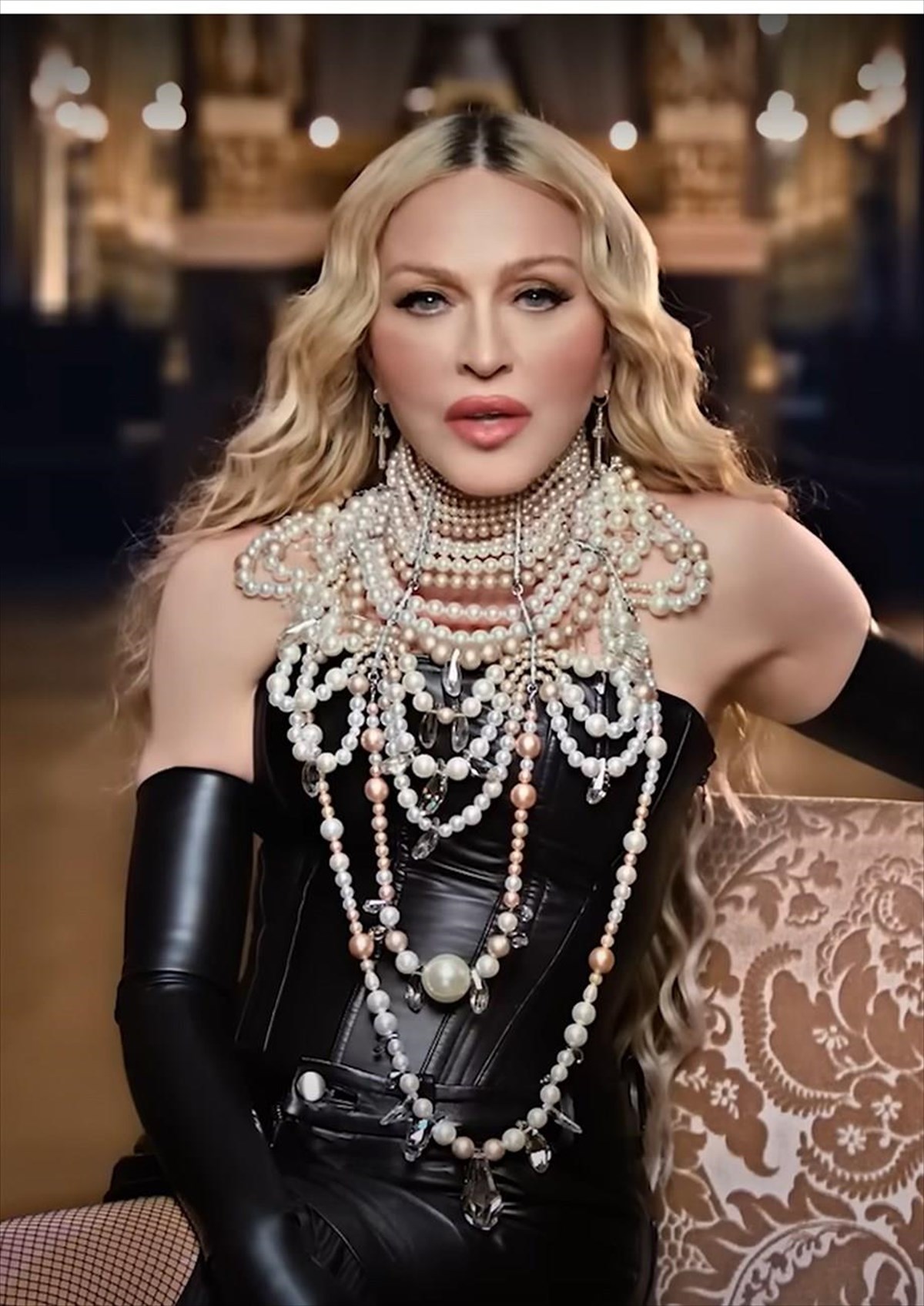 Το επιβλητικό κολιέ Plastron "Rosé Élégance" των On Aura Tout Vu συνδυάζει με τόλμη κρύσταλλα και μαργαριτάρια διαφόρων μεγεθών σε μια παλέτα χρωμάτων που κυμαίνεται από ροζ της πούδρας έως ιβουάρ, κι από μπεζ έως υπόλευκο. Το κολιέ ήταν ειδική παραγγελία για την Madonna και αν θέλει κάποιος να το αποκτήσει μπορεί να επικοινωνήσει με τους On Aura Tout Vu.