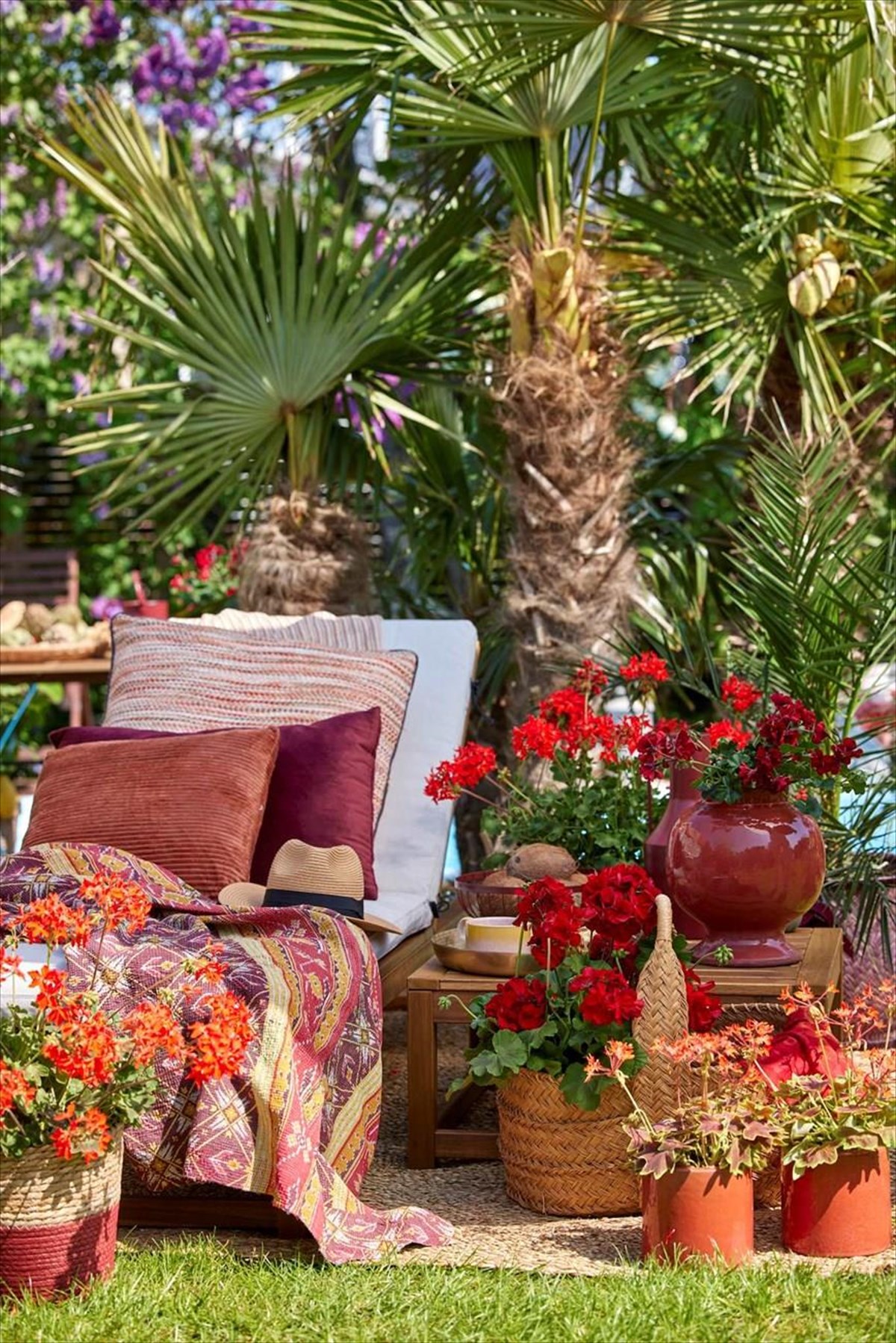 Η θέα και μόνο των γερανιών φέρνει στο νου τις διακοπές, και αυτό γιατί είναι ένα φυτό που ανθίζει τους καλοκαιρινούς μήνες, ενώ είναι και ευρέως διαδεδομένο στις ηλιόλουστες περιοχές της νότιας Ευρώπης. Τα γεράνια είναι ιδανικά για παρτέρια και μπαλκόνια, καθώς λόγω της νοτιοαφρικανικής καταγωγής τους, αντέχουν στον έντονο μεσημεριανό ήλιο και δεν επηρεάζονται από την ακραία ζέστη ή την  ξηρασία. Μπορούν να συνδυαστούν με άλλα φυτά που αγαπούν επίσης τον ήλιο και τη ζέστη, όπως φοίνικες ή λεμονιές, για να δημιουργήσουν μια μεσογειακή αίσθηση που συναγωνίζεται οποιονδήποτε προορισμό καλοκαιρινών διακοπών. Για να δημιουργήσετε ένα πραγματικό καλοκαιρινό καταφύγιο στον κήπο, στο μπαλκόνι ή τη βεράντα σας, χρειάζεστε και μερικές ακόμα «διακοσμητικές πινελιές». Αντικείμενα όπως ψάθινα έπιπλα και αξεσουάρ, πολύχρωμα μαξιλάρια και άνετες κουβέρτες είναι απαραίτητα για έναν χαλαρωτικό και boho υπαίθριο χώρο.