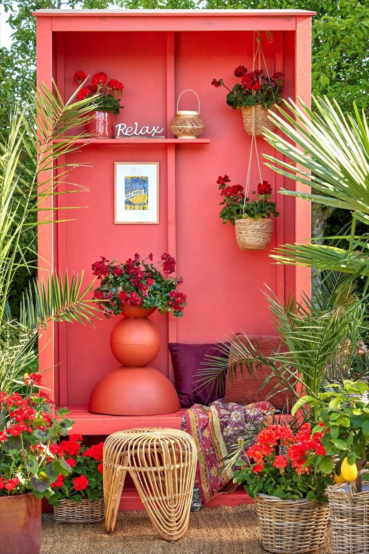Τα αυτοσχέδια έπιπλα και οι γλάστρες είναι κάτι περισσότερο από μια απλή διακόσμηση. Κάνουν τον υπαίθριο χώρο σας μοναδικό και δημιουργούν μια φιλόξενη και ζεστή ατμόσφαιρα. Και το καλύτερο; Μπορείτε να σχεδιάσετε τα πάντα σύμφωνα με το δικό σας γούστο και να βάλετε την προσωπική σας πινελιά. Το χειροποίητο σκεπαστό έπιπλο θυμίζει ένα παραδοσιακό παραθαλάσσιο παγκάκι και ταυτόχρονα προσφέρει προστασία από τον αέρα και τον ήλιο, καθιστώντας το ιδανικό για χαλάρωση στον κήπο, ανεξαρτήτως συνθηκών. Τα πολύχρωμα γεράνια σε γλάστρες και καλάθια, σε συνδυασμό με διάφορα διακοσμητικά αξεσουάρ, δημιουργούν μια μοναδική αίσθηση εξωτικών διακοπών.