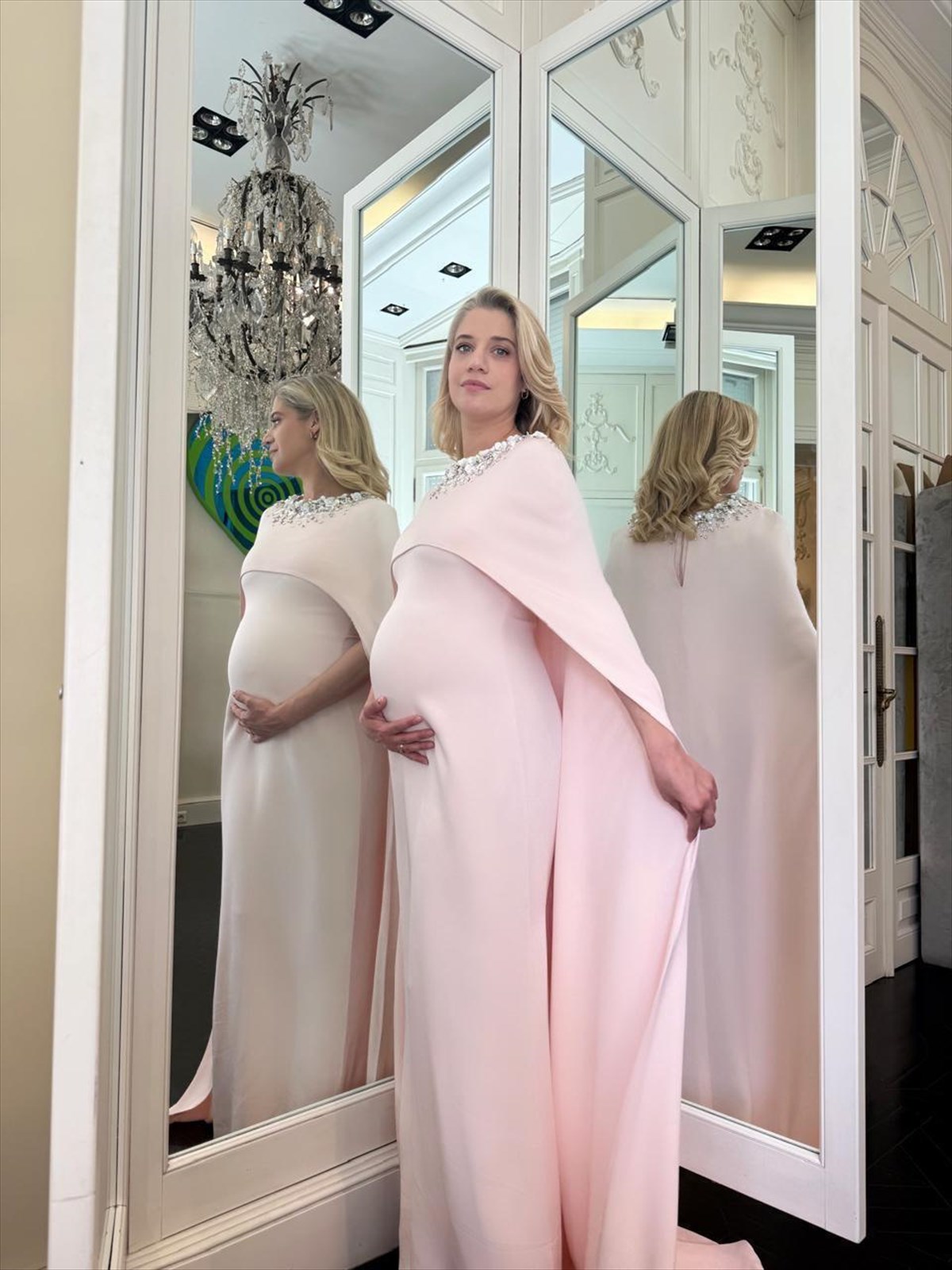 Η Τζένη Θεωνά, η οποία διανύει τον πέμπτο μήνα της εγκυμοσύνης της, επέλεξε μια ξεχωριστή δημιουργία του ιστορικού Οίκου Celia Kritharioti. Πρόκειται για ένα απαλό ροζ φόρεμα σε συνδυασμό με μια εντυπωσιακή, χειροποίητη κεντημένη κάπα, διακοσμημένη με λουλούδια και λαμπερά κρύσταλλα. Ένα look που απέπνεε ρομαντισμό, κομψότητα και συμβολισμό, αναδεικνύοντας τη σύγχρονη γυναικεία θηλυκότητα μέσα από την τέχνη της υψηλής ραπτικής.