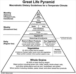 Ο Michio Kushi, κύριος υποστηρικτής της μακροβιοτικής, εισήγαγε την μακροβιοτική Μεγάλη Πυραμίδα Ζωής (Great Life Pyramid) . Όπως μπορεί να δει κανείς, διαφέρει από τις άλλες πυραμίδες διατροφής (όπως τη Μεσογειακή ή τη Χορτοφαγική) στη ρητή συμπερίληψη θαλάσσιων λαχανικών και στην αποέμφαση, αλλά όχι αποκλεισμό, της πρόσληψης φρούτων (αλλά όχι λαχανικών). Όπως και άλλες εναλλακτικές πυραμίδες διατροφής και αντίθετα με την USDA Food Guide Pyramid, το κόκκινο κρέας και η πρόσληψη γαλακτοκομικών τροφίμων ελαχιστοποιούνται. Η πυραμίδα της μακροβιοτικής διατροφής (Great Life Pyramid) δείχνει της διατροφικές συστάσεις της μακροβιοτικής για ένα εύκρατο κλίμα. Το φαγητό που καταναλώνεται θα πρέπει να είναι φυσικής ποιότητας, βιολογικής καλλιέργειας όσο το δυνατόν περισσότερο και παραδοσιακά ή φυσικά μεταποιημένα.