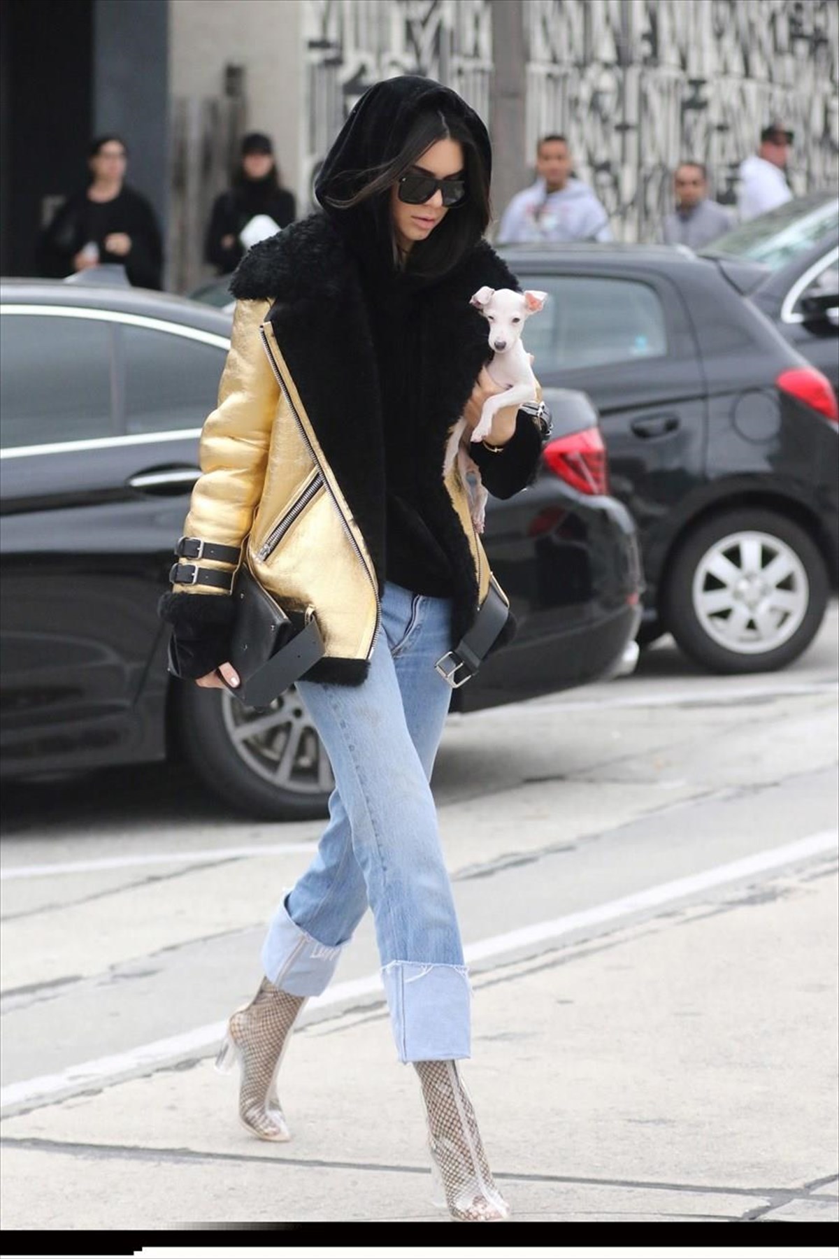 Η Kendall Jenner, ως μάλλον πιο κακόγουστη, φόρεσε χρυσό τζάκετ με μαύρη γούνινη επένδυση, ξεβαμμένο τζιν με έντονο ρεβέρ και κάτι φρικτά κακόγουστα, λευκά διάφανα μποτάκια, στην ίδια απόχρωση με ένα μικροσκοπικό σκυλάκι που κρατούσε στο αριστερό της χέρι ως αξεσουάρ. Και για να μην είναι γυμνές οι πατούσες της, φόρεσε και λευκά διχτυωτά καλτσάκια. Ε, αυτό καλύτερα να μην το αντιγράψουμε... Στα δίχτυα του ψαρά.