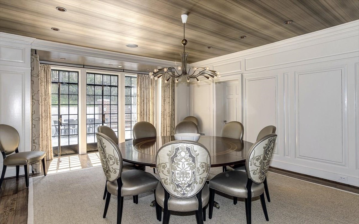 Τι κρατάω από τις φωτογραφίες; Το λευκό και το παστέλ σιέλ στους τοίχους. Τα φωτιστικά με τις χρυσές λεπτομέρειες. Την μίνιμαλ, αριστοκρατική διακόσμηση. Τις μπεζ κουρτίνες. Τα γυάλινα βάζα. Τις ασημένιες κουρτίνες. Τα δερμάτινα σκαμπό. Τα μαύρα κομοδίνο. Την φουτουριστική κουζίνα. Την τραπεζαρία για 10 άτομα. Το μάρμαρο παντού. Α και τους πίνακες ζωγραφικής στο ίδιο μέγεθος με την τηλεόραση. Με το …ίδιο μαύρο πλαίσιο.