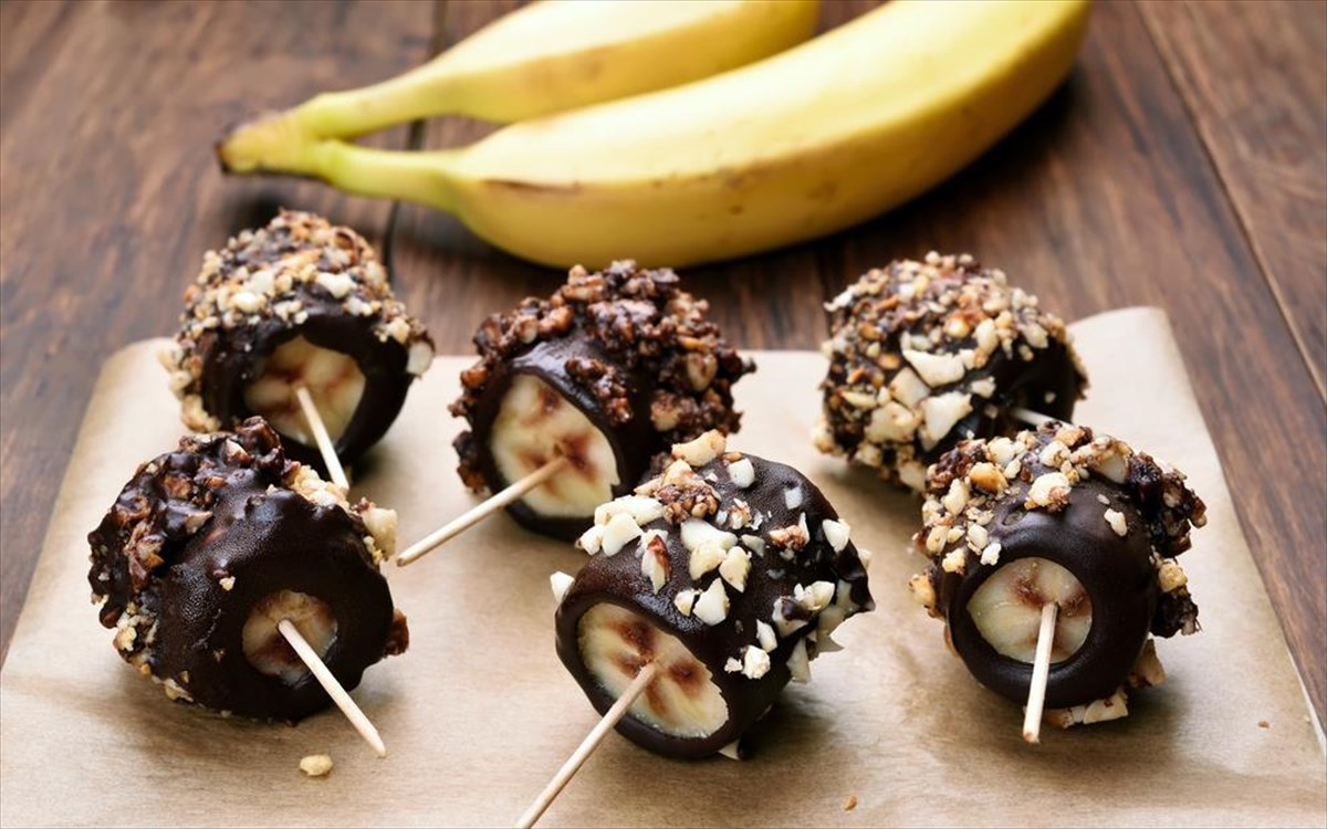 - Κόψτε μια μπανάνα σε ροδέλες, λιώστε 2 κομμάτια κουβερτούρας σε μπεν μαρί και περιχύστε τη σοκολάτα σας στη μπανάνα.