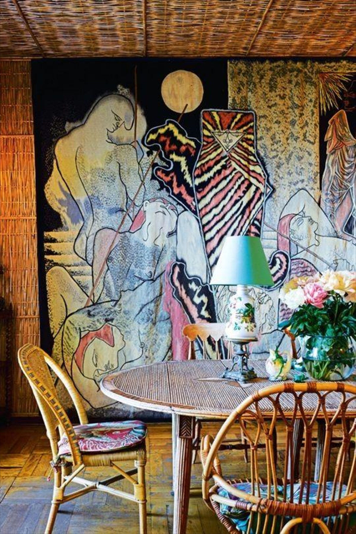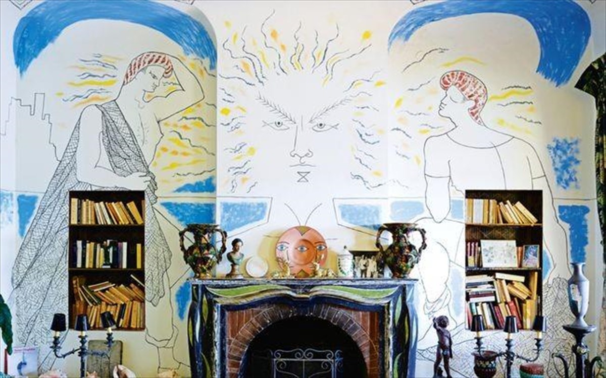Σχέδια παντού. Γιατί στο σπίτι του Jean Cocteau ακόμη και οι ντουλάπες έχουν …μάτια. Και αυτιά; Oι τοίχοι πάντως αποκαλύπτουν οργισμένους θεούς, γαλήνια πρόσωπα, αστραπές και ήλιο.